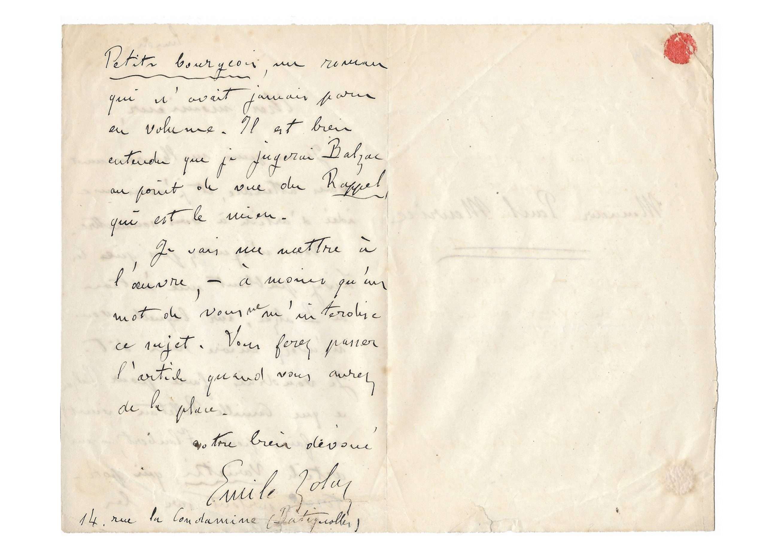 Nice Zola letter, looking on writing an article on Honoré de Balzac, a few months before the publication of the first volume of Rougon-Macquart.