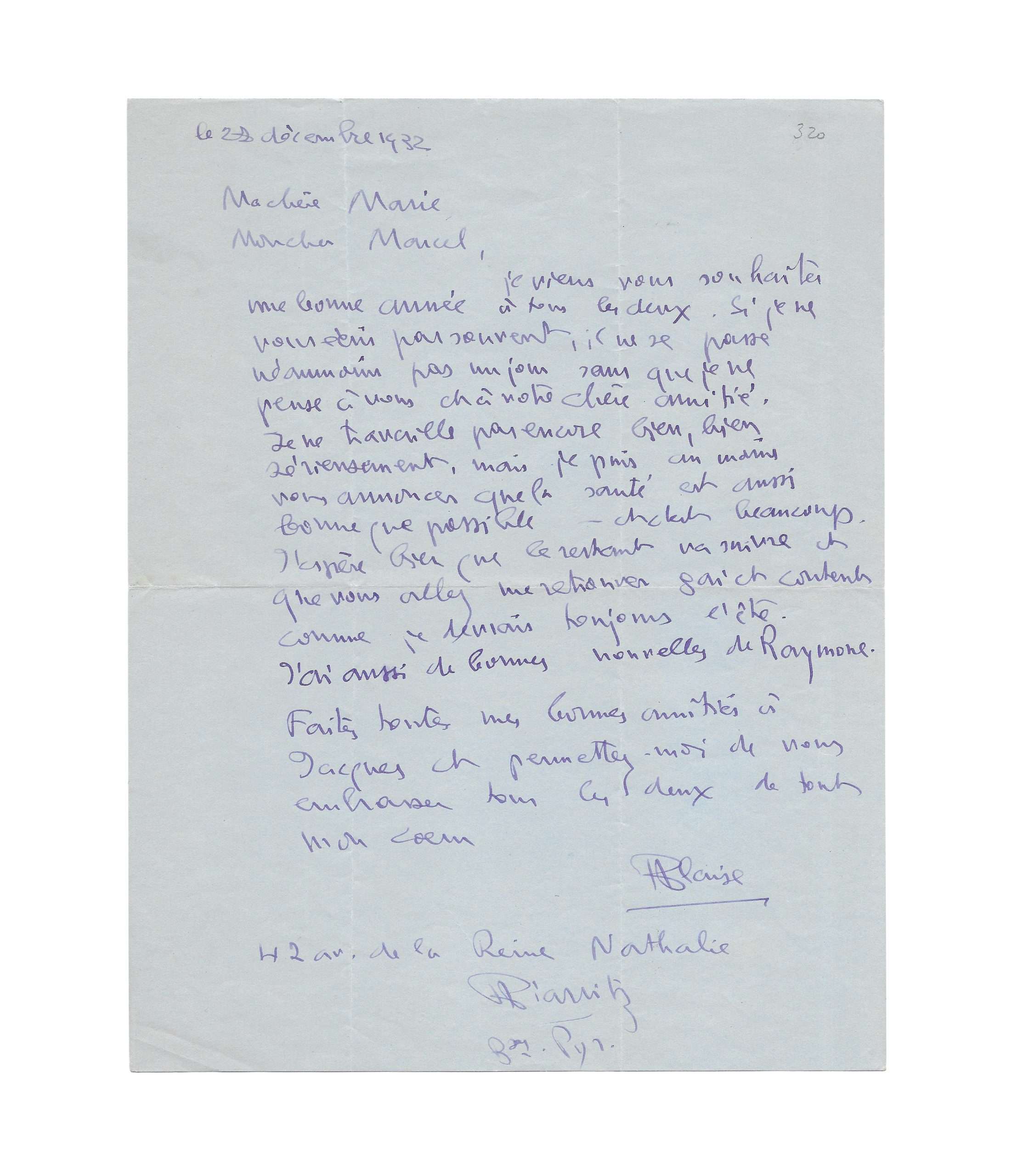 Autograph letter signed “Blaise” to Marcel Jouhandeau and his mother Marie