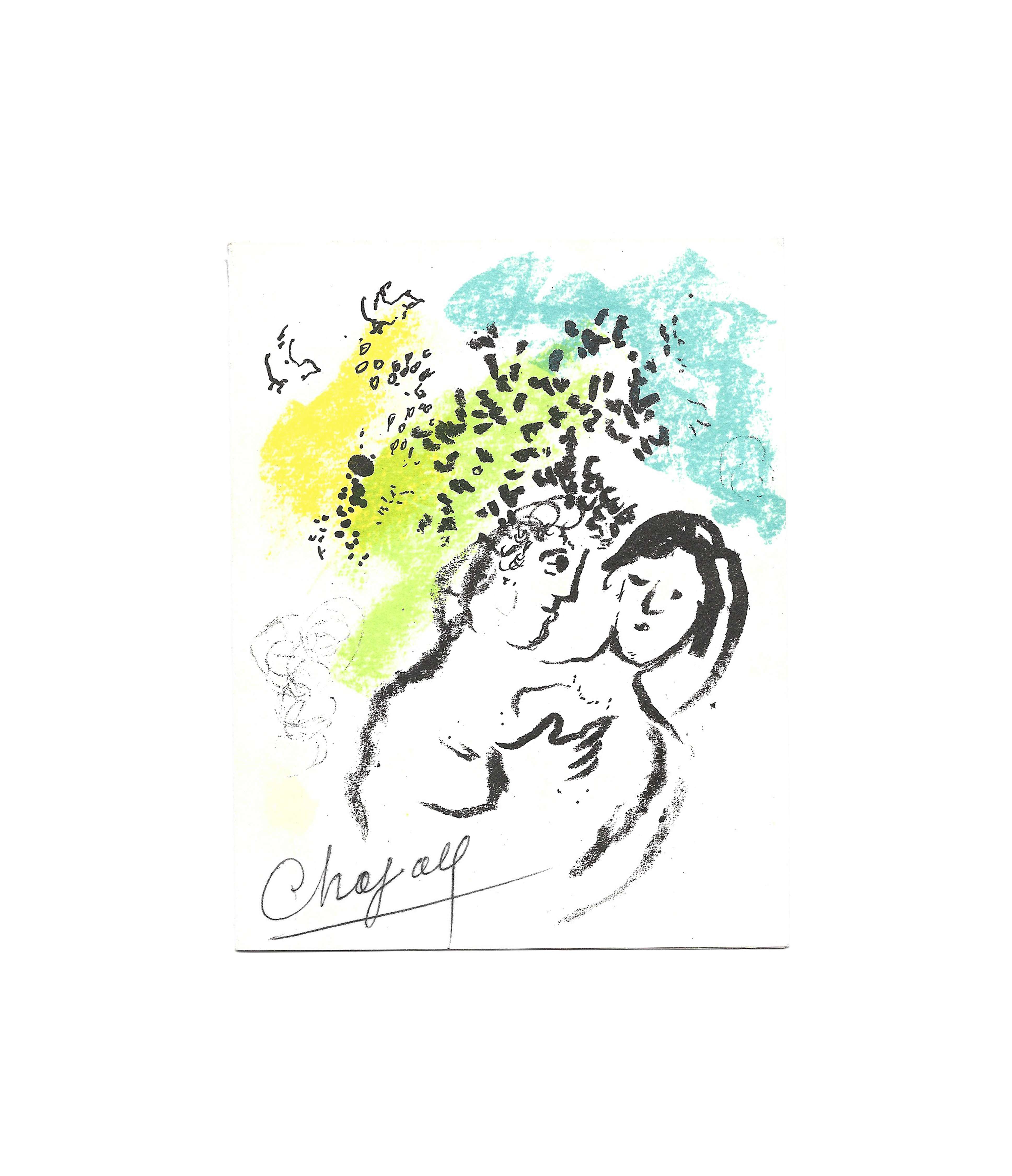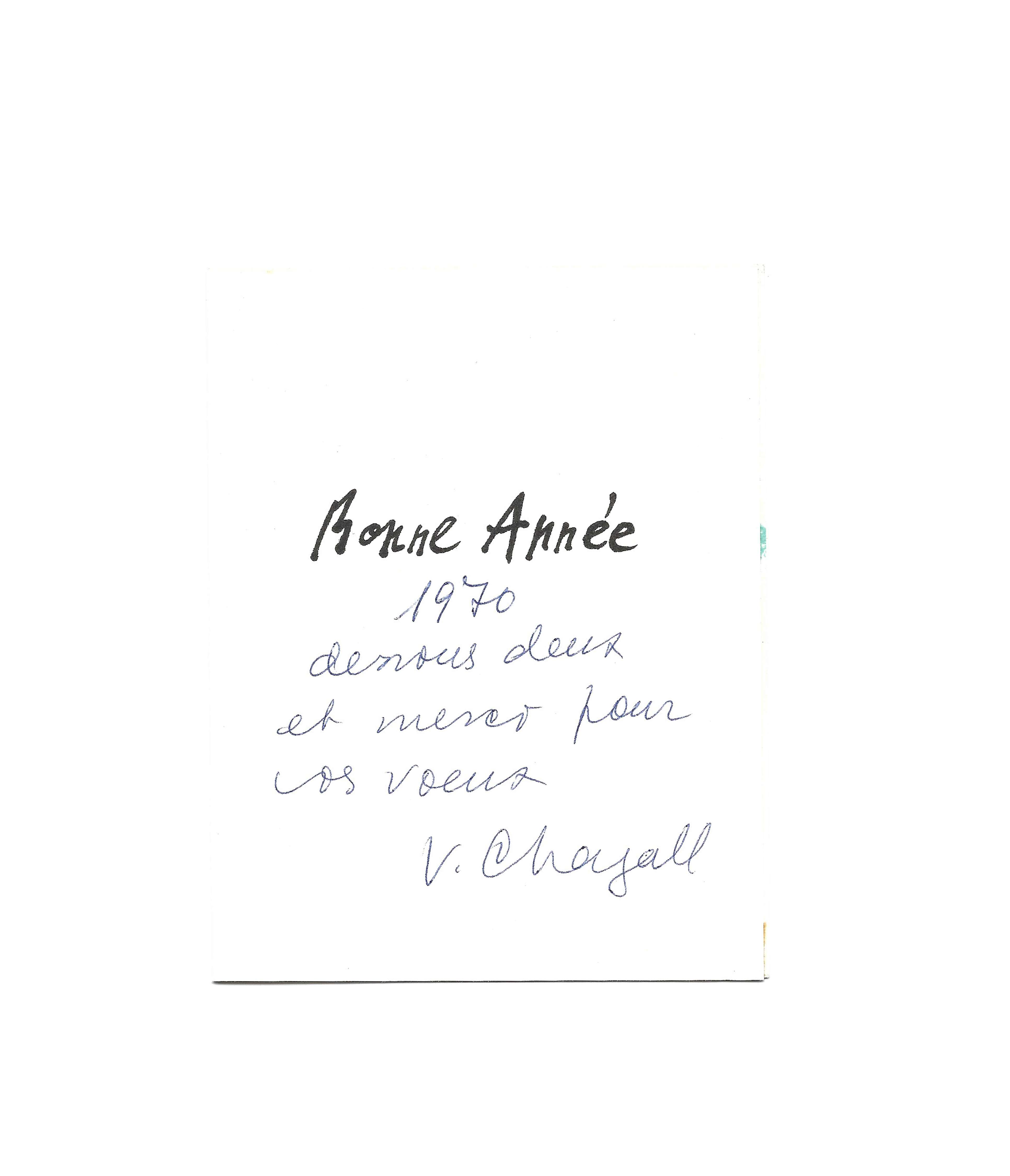 Beautiful greeting card decorated with an original lithograph, written and signed, in the name of the Chagall couple, by Vava Chagall, the painter’s last wife