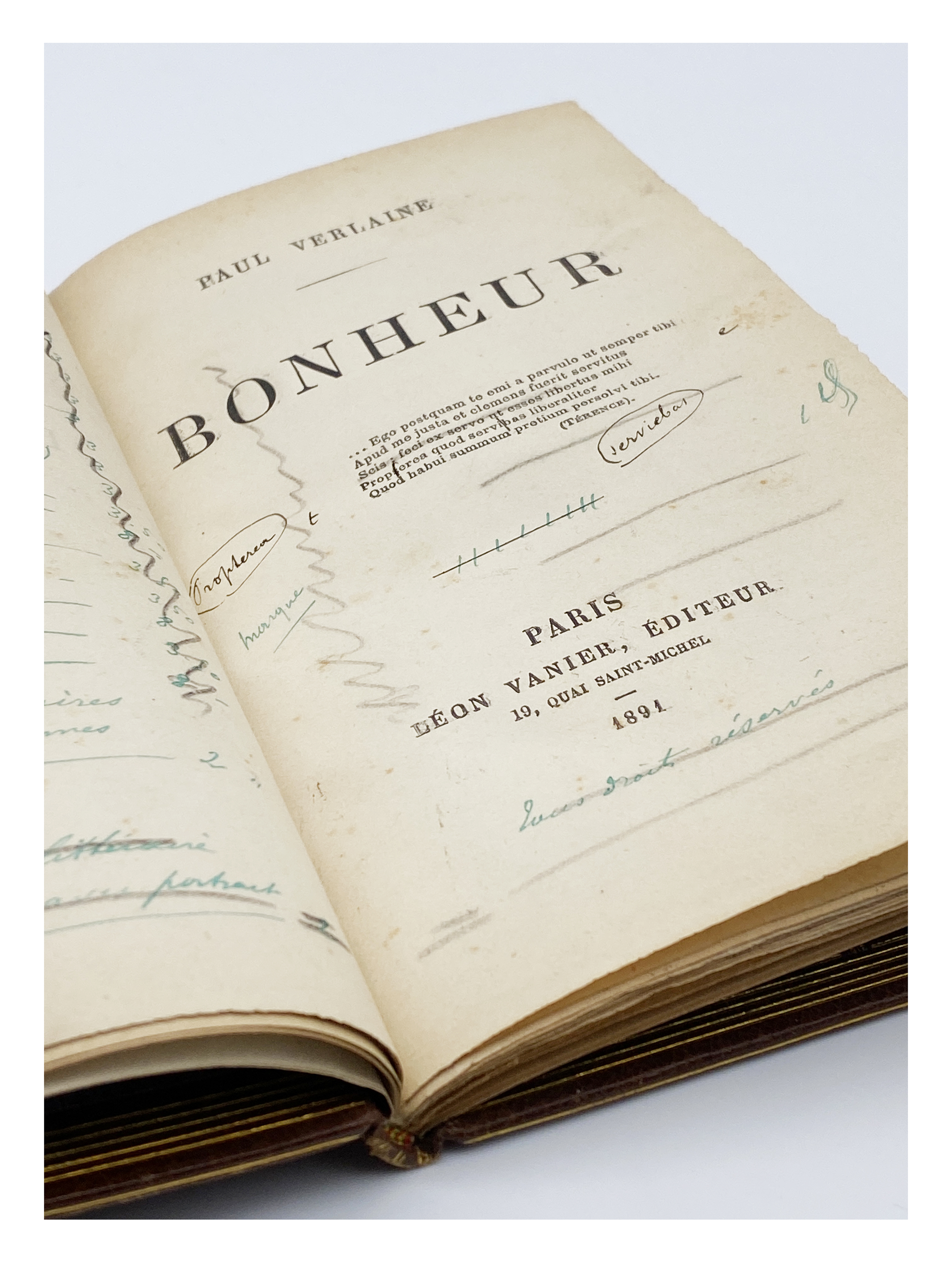 A list of Verlaine’s poetic works in green ink can be found next to the title page.