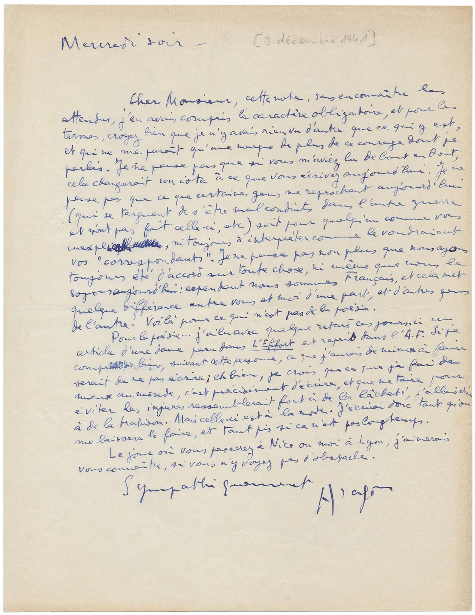 « Cher Monsieur, cette note, sans en connaître les attendus, j’en avais compris le caractère obligatoire, et pour les termes, croyez bien que je n’y avais rien vu d’autre que ce qui y est, et qui ne me paraît qu’une marque de plus de ce courage dont je parlais. Je ne pense pas que si vous m’aviez lu de bout en bout, cela changerait un iota à ce que vous écrivez aujourd’hui. Je ne pense pas que ce que certaines gens me reprochent aujourd’hui (qui se targuent de s’être mal conduits dans l’autre guerre et qui n’ont pas fait celle-ci, etc.) soit pour quelqu’un comme vous inexplicable, ni toujours à interpréter comme le voudraient vos “correspondants”. Je ne pense pas non plus que nous ayons toujours été d’accord sur toute chose, ni même que nous le soyons aujourd’hui : cependant nous sommes Français, et cela met quelques différences entre vous et moi d’une part, et d’autres gens de l’autre. Voilà pour ce qui n’est pas de la poésie.