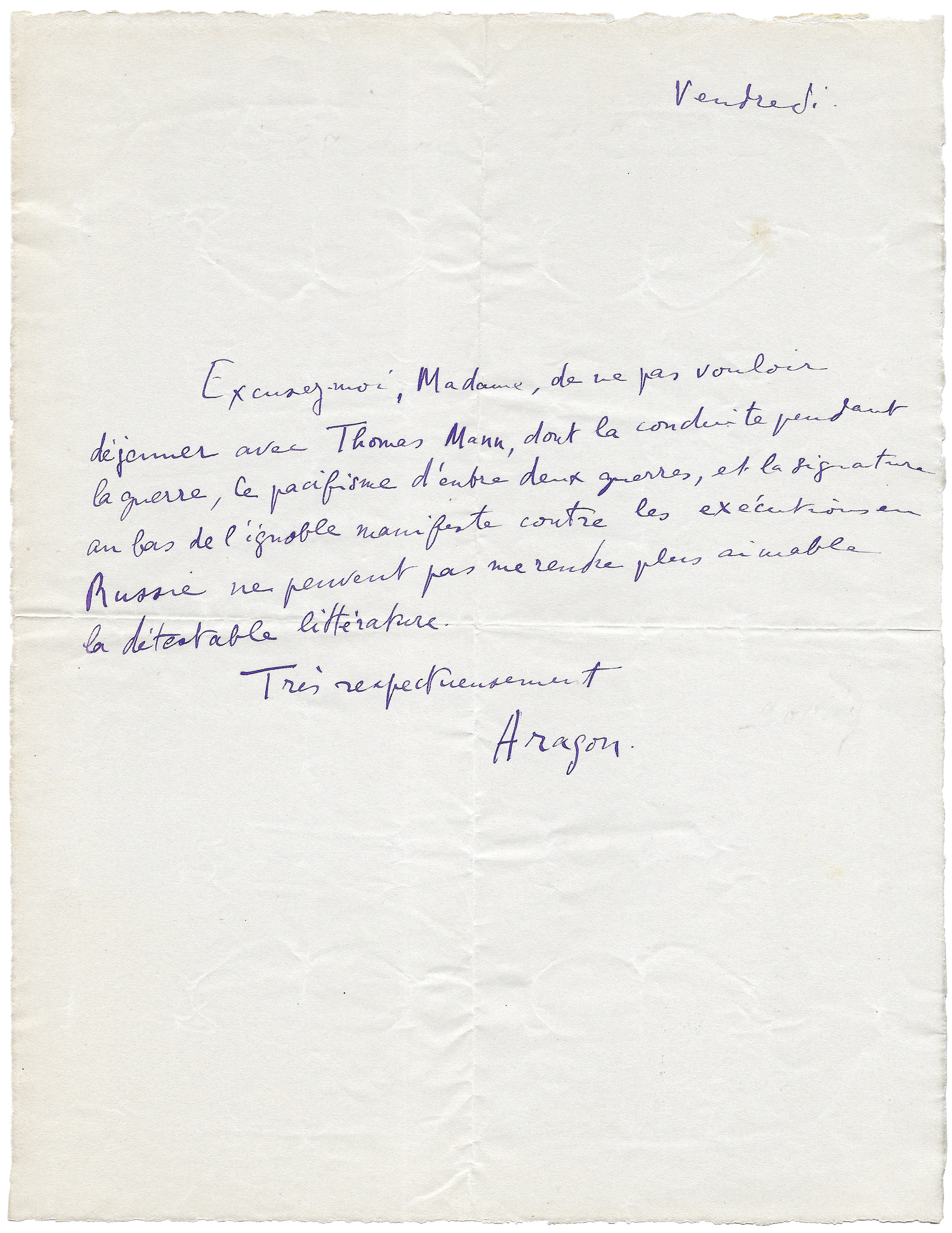 « Excusez-moi, Madame, de ne pas vouloir déjeuner avec Thomas Mann, dont la conduite pendant la guerre, le pacifisme d’entre deux guerres, et la signature au bas de l’ignoble manifeste contre les exécutions en Russie ne peuvent pas me rendre plus aimable la détestable littérature.