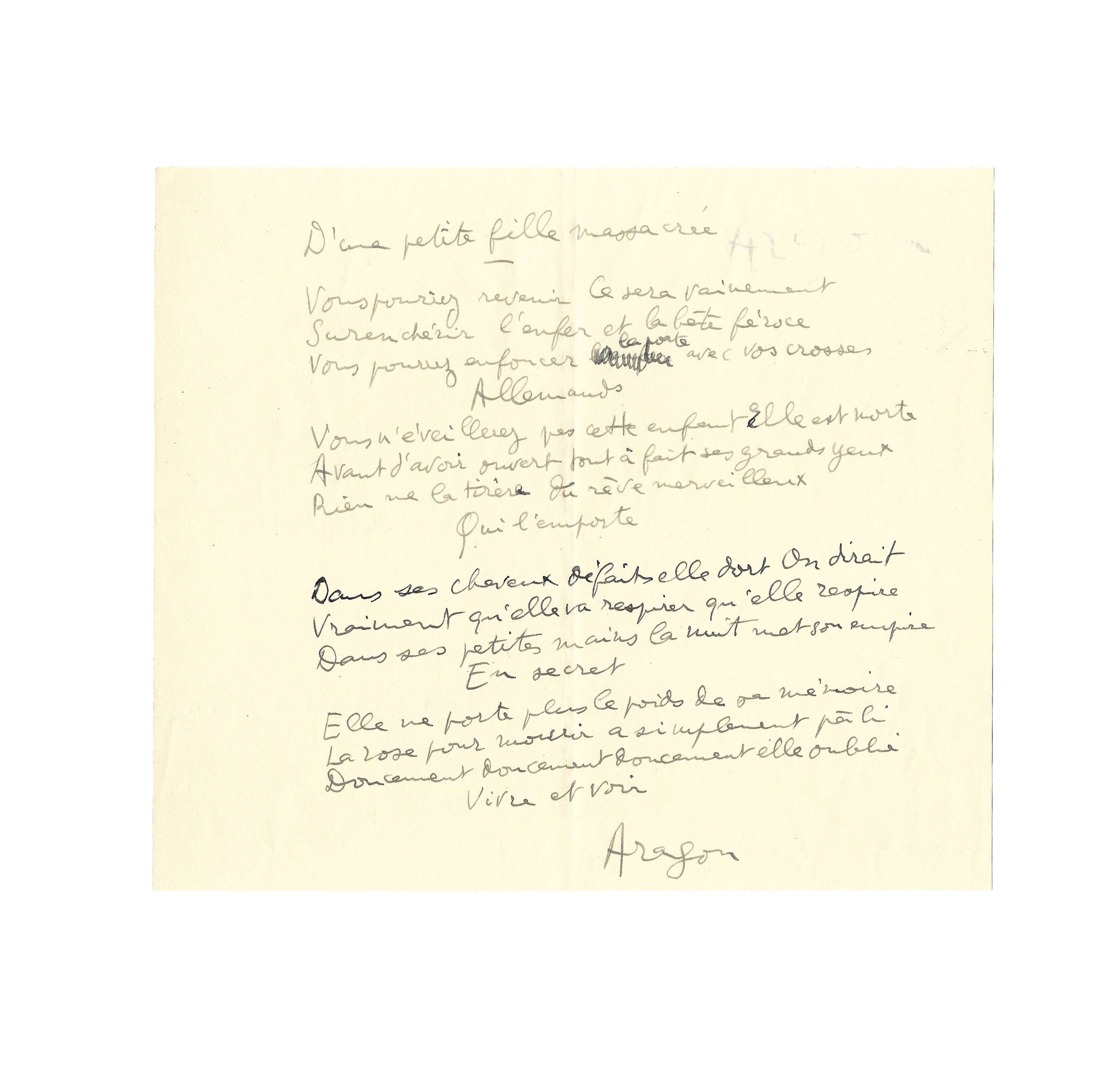 Autograph poem signed « Aragon »