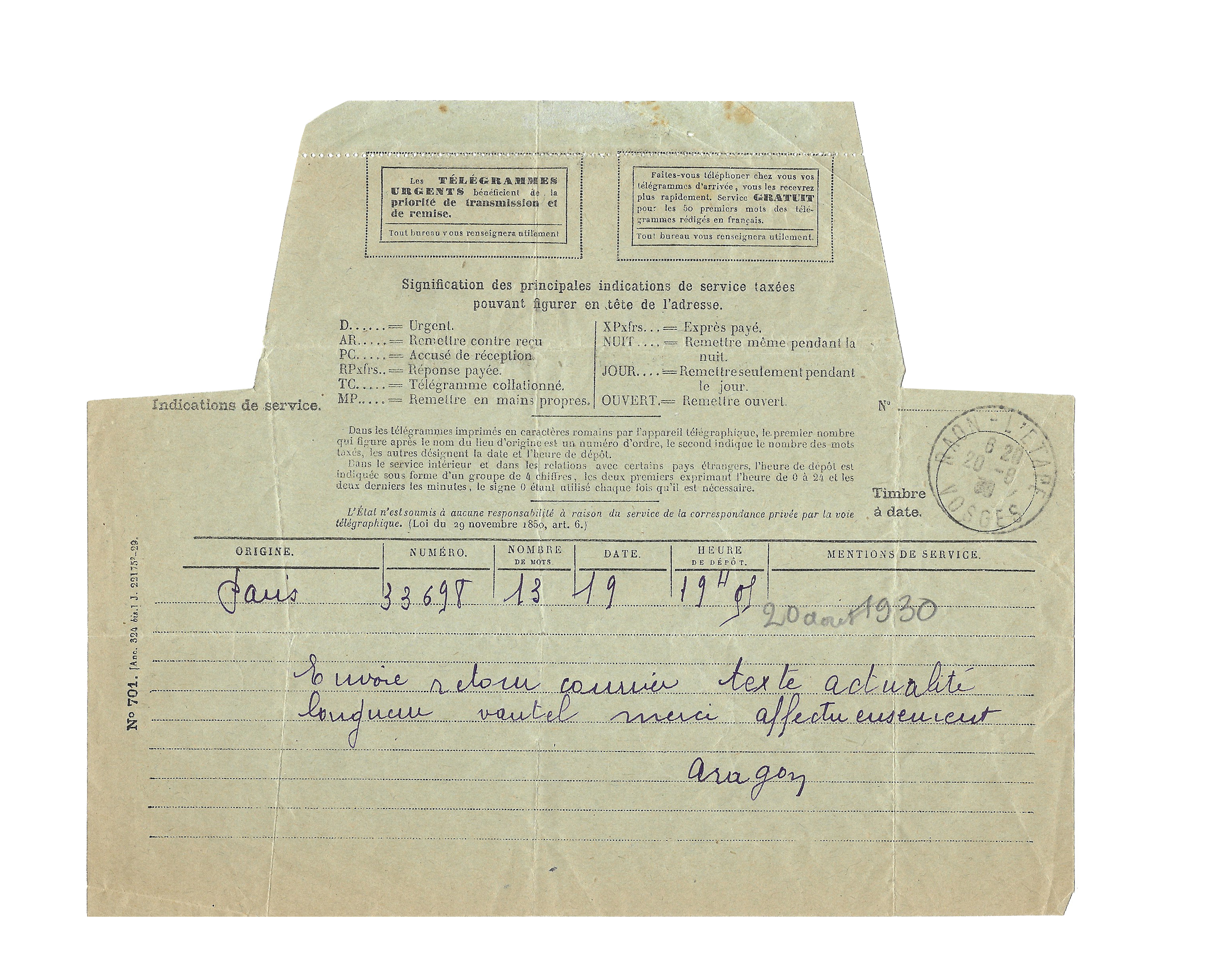 We attach : A telegram by Louis Aragon to Georges Sadoul