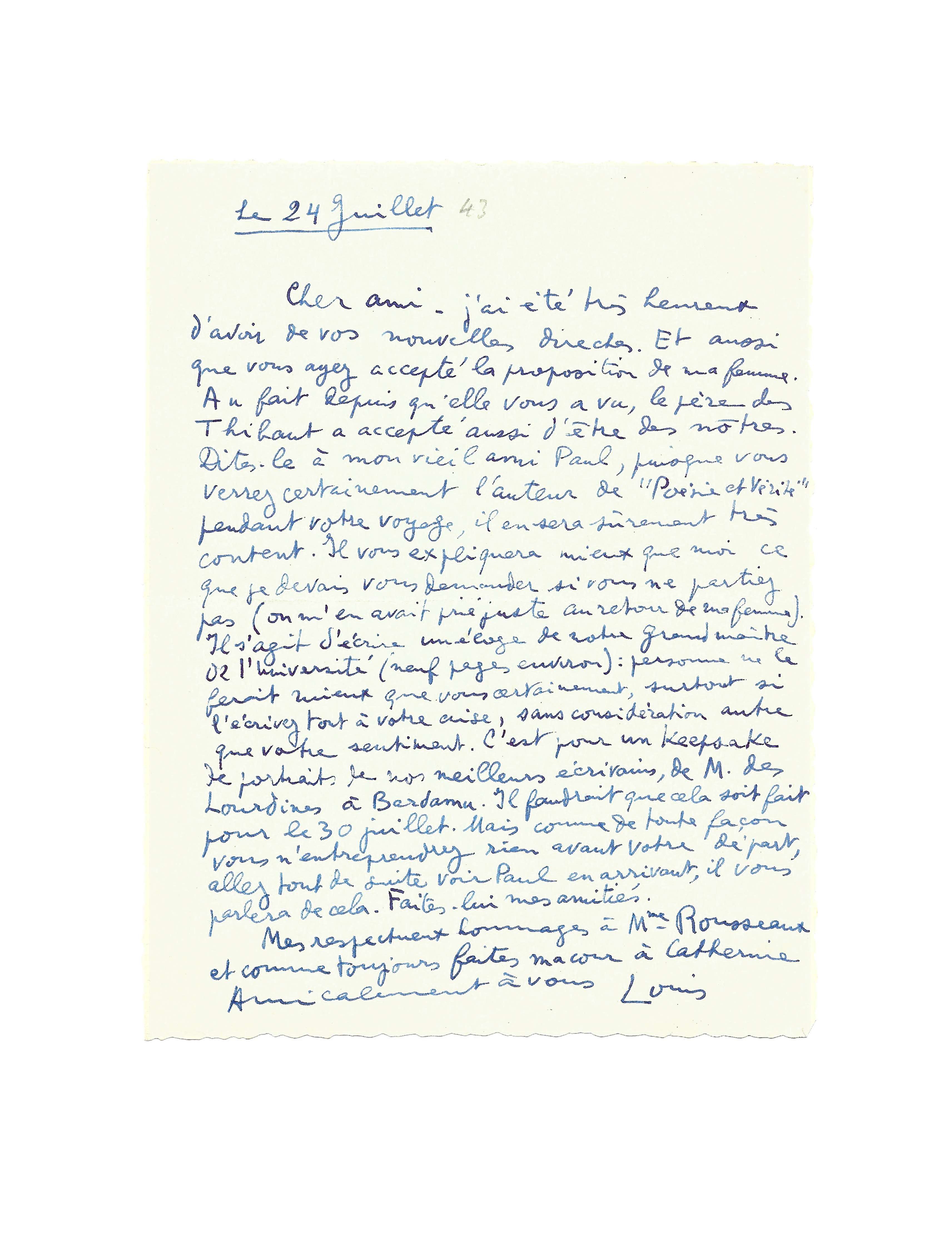 “Cher ami, j’ai été très heureux d’avoir de vos nouvelles directes. Et aussi que vous ayez accepté la proposition de ma femme [Elsa Triolet]. Au fait depuis qu’elle vous a vu, le père des Thibault [Roger Martin du Gard] a accepté aussi d’être des nôtres. Dites-le à mon vieil ami Paul [Eluard], puisque vous verrez certainement l’auteur de “Poésie et Vérité” pendant votre voyage, il en sera sûrement très content. Il vous expliquera mieux que moi ce que je devais vous demander si vous ne partiez pas (on m’en avait prié juste au retour de ma femme). Il s’agit d’écrire un éloge de notre grand maître de l’université (neuf pages environs) : personne ne la ferait mieux que vous certainement, surtout si [vous] l’écrivez tout à votre aise, sans considération autre que votre sentiment. C’est pour un keepsake de portraits de nos meilleurs écrivains, de M. des Lourdines à Bardamu. Il faudrait que cela soit fait pour le 30 juillet. Mais comme de toute façon vous n’entreprendrez rien avant votre départ, allez tout de suite voir Paul en arrivant, il vous parlera de cela. Faites-lui mes amitiés.