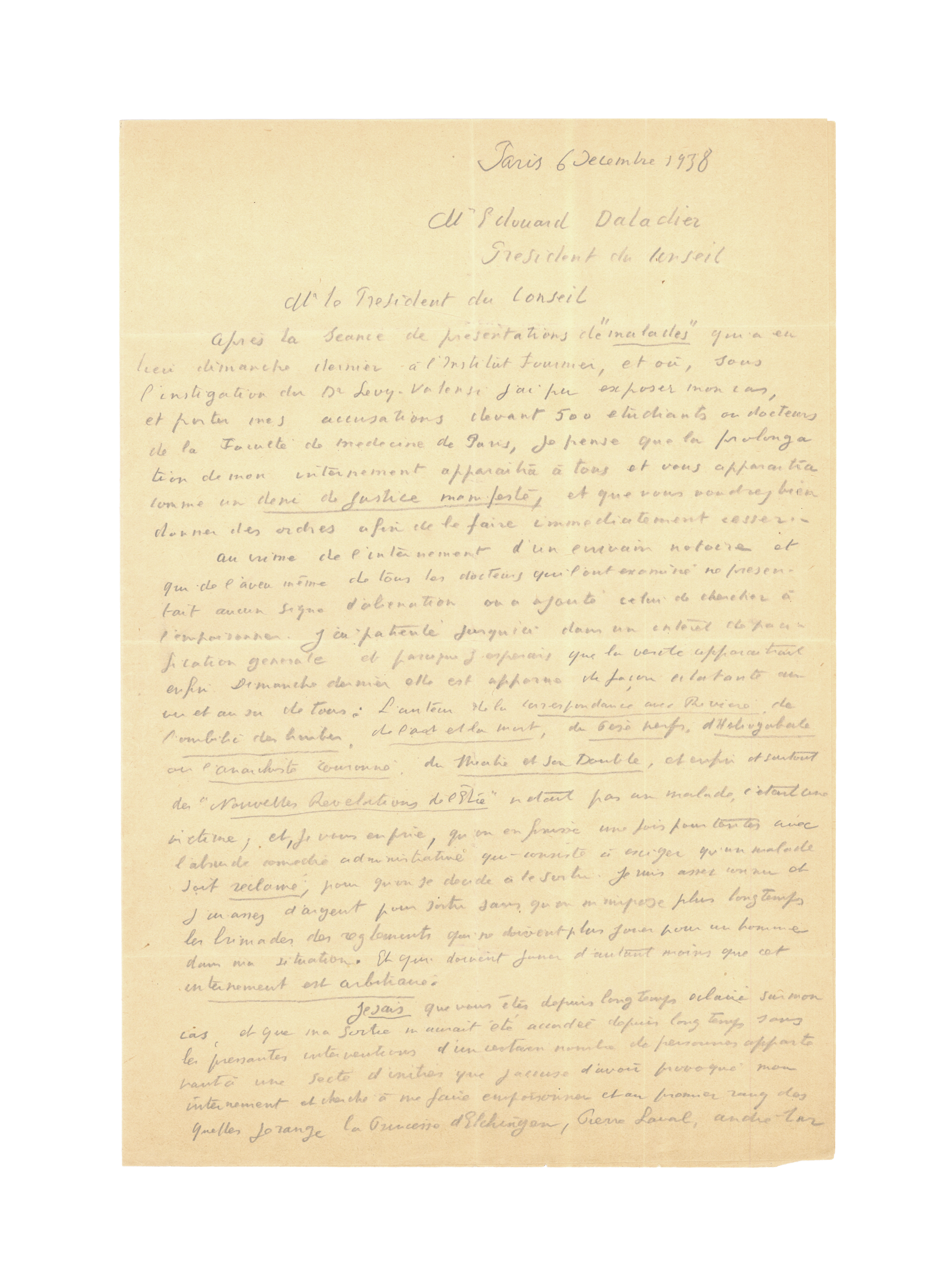 Je sais que vous êtes depuis longtemps éclairci sur mon cas, et que ma sortie m’aurait été accordée depuis longtemps sans les pressantes interventions d’un certain nombre de personnes appartenant à une secte d’initiés que j’accuse d’avoir provoqué mon internement et cherche à me faire empoisonner et au premier rang desquelles [sic] je range la Princesse d’Elchingen, Pierre Laval, André Tardieu et même Pierre Etienne Flandin, sans compter d’autres personnes moins haut placées politiquement mais qui n’en ont pas pour cela moins d’importance socialement parlant, telles que Louis Louis-Dreyfus, Raymond Bernard, Marcel l’Herbier, Germaine Meyer de la Banque Hypothécaire, Mary Marquet, José[e] Laval etc. etc.