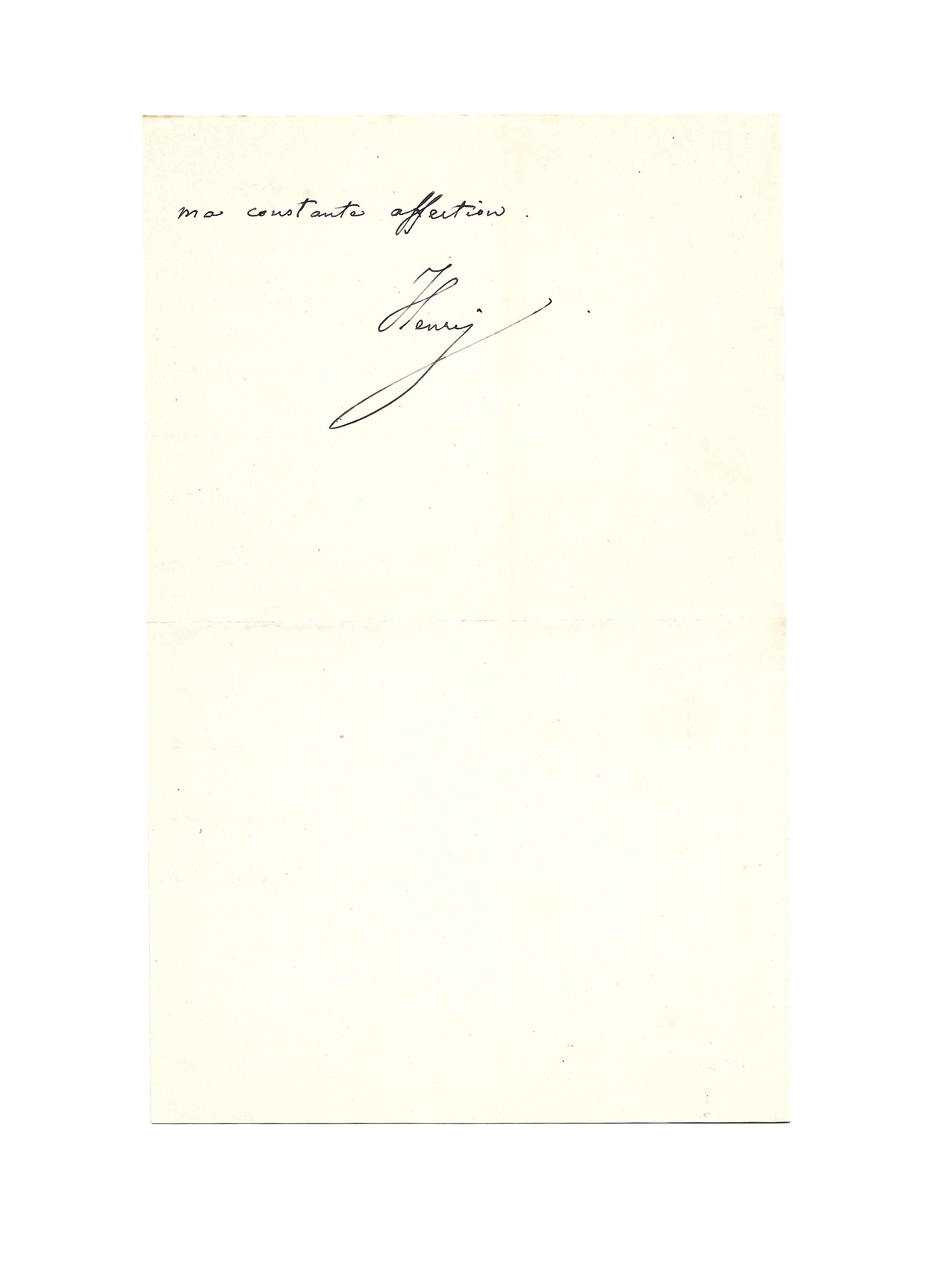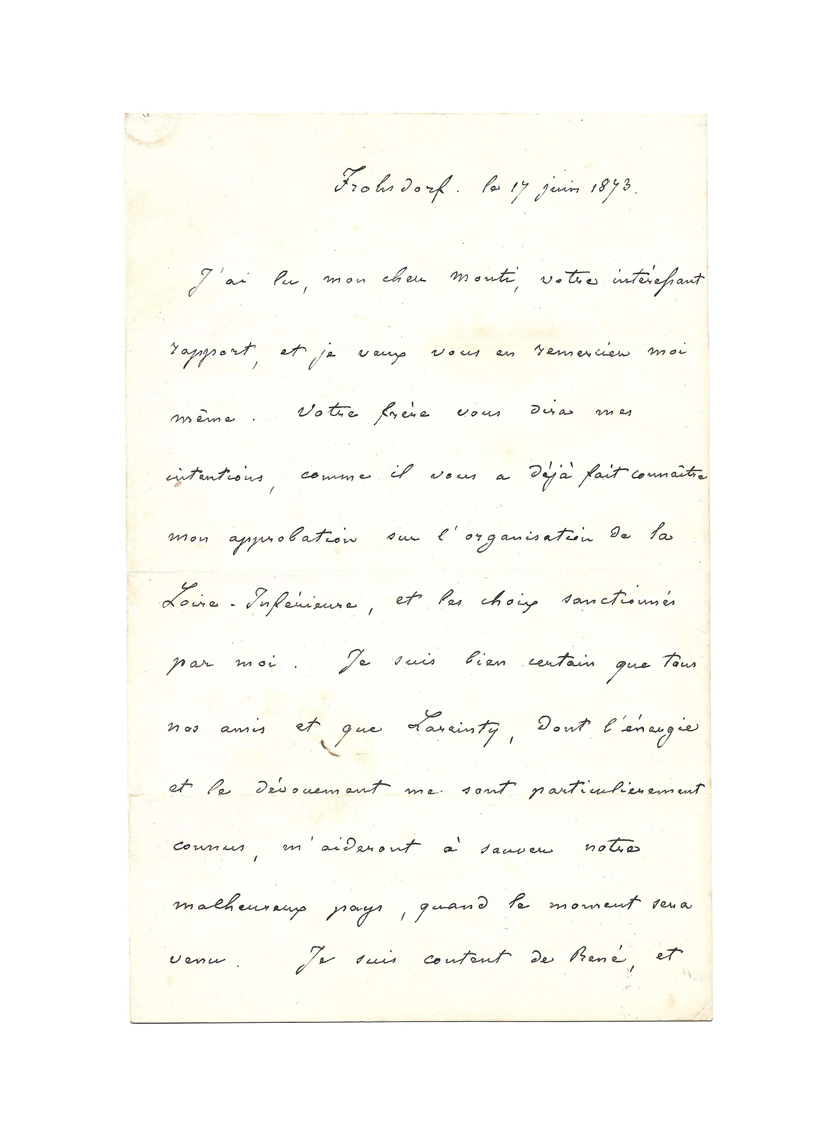 « J’ai lu, mon cher Monti, votre intéressant rapport, et je veux vous en remercier moi-même. Votre frère [Edouard de Monti de Rezé (1808-1877), aide de camp du comte de Chambord] vous dira mes intentions, comme il vous a déjà fait connaître mon approbation sur l’organisation de la Loire-Inférieure, et les choix sanctionnés par moi. Je suis bien certain que tous nos amis et que Lareinty [Henri Baillardel de Lareinty (1824-1901), monarchiste légitimiste, sénateur et président du conseil général de la Loire-Atlantique en 1876], dont l’énergie et le dévouement me sont particulièrement connus, m’aideront à sauver notre malheureux pays, quand le moment sera venu. Je suis content de René [de Monti de Rezé (1848-1934), fils du destinataire de la lettre], et je sais gré à Madame de Monti et à vous de me l’avoir donné. Comptez sur ma gratitude, et sur mon entière affection. Henri »