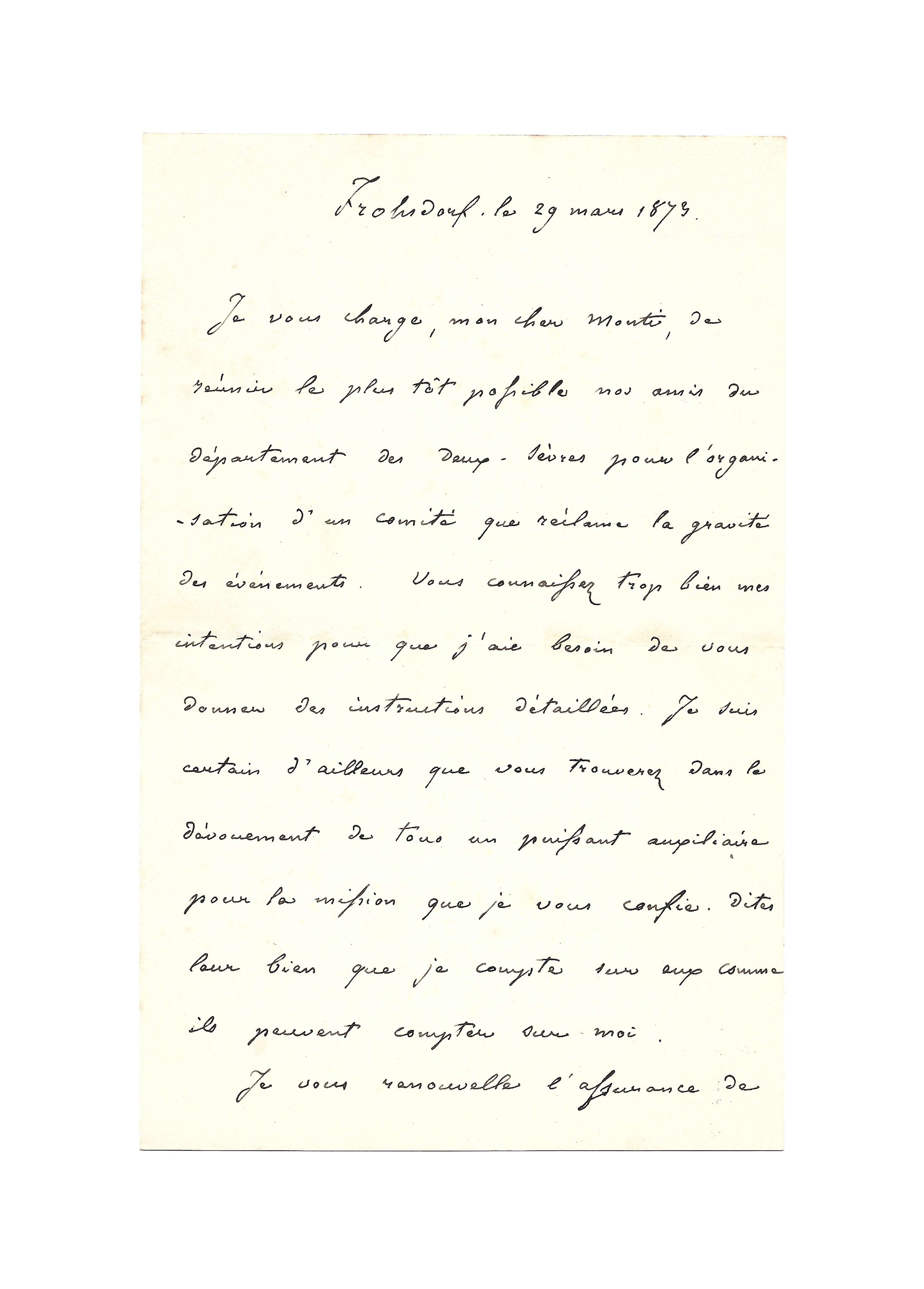 « Je vous charge, mon cher Monti, de réunir le plus tôt possible nos amis du département des Deux-Sèvres pour l’organisation d’un comité que réclame la gravité des évènements. Vous connaissez trop bien mes intentions pour que j’aie besoin de vous donner des instructions détaillées. Je suis certain d’ailleurs que vous trouverez dans le dévouement de tous un puissant auxiliaire pour la mission que je vous confie. Dites-leur bien que je compte sur eux comme ils peuvent compter sur moi. Je vous renouvelle l’assurance de ma constante affection. Henri »