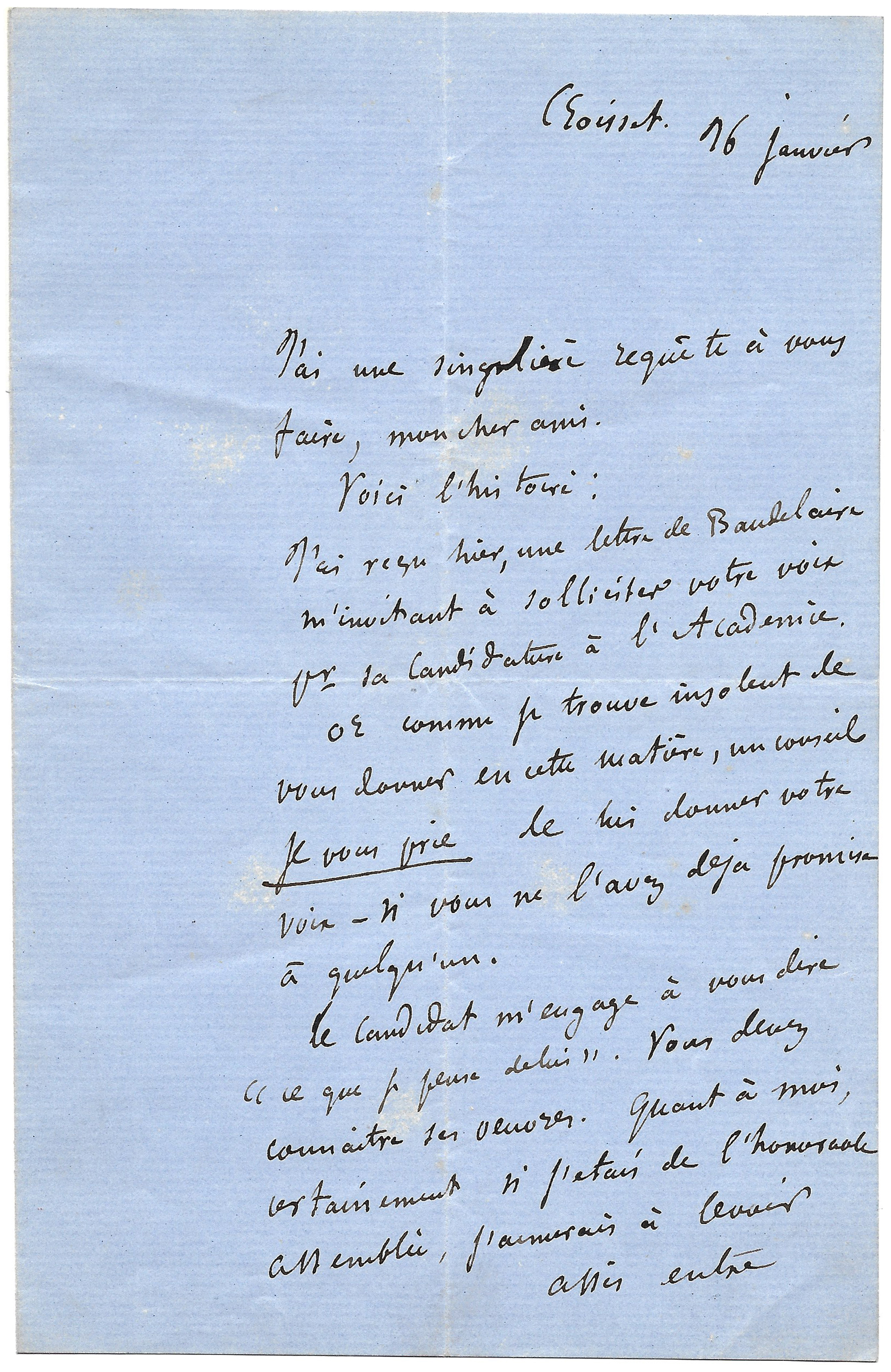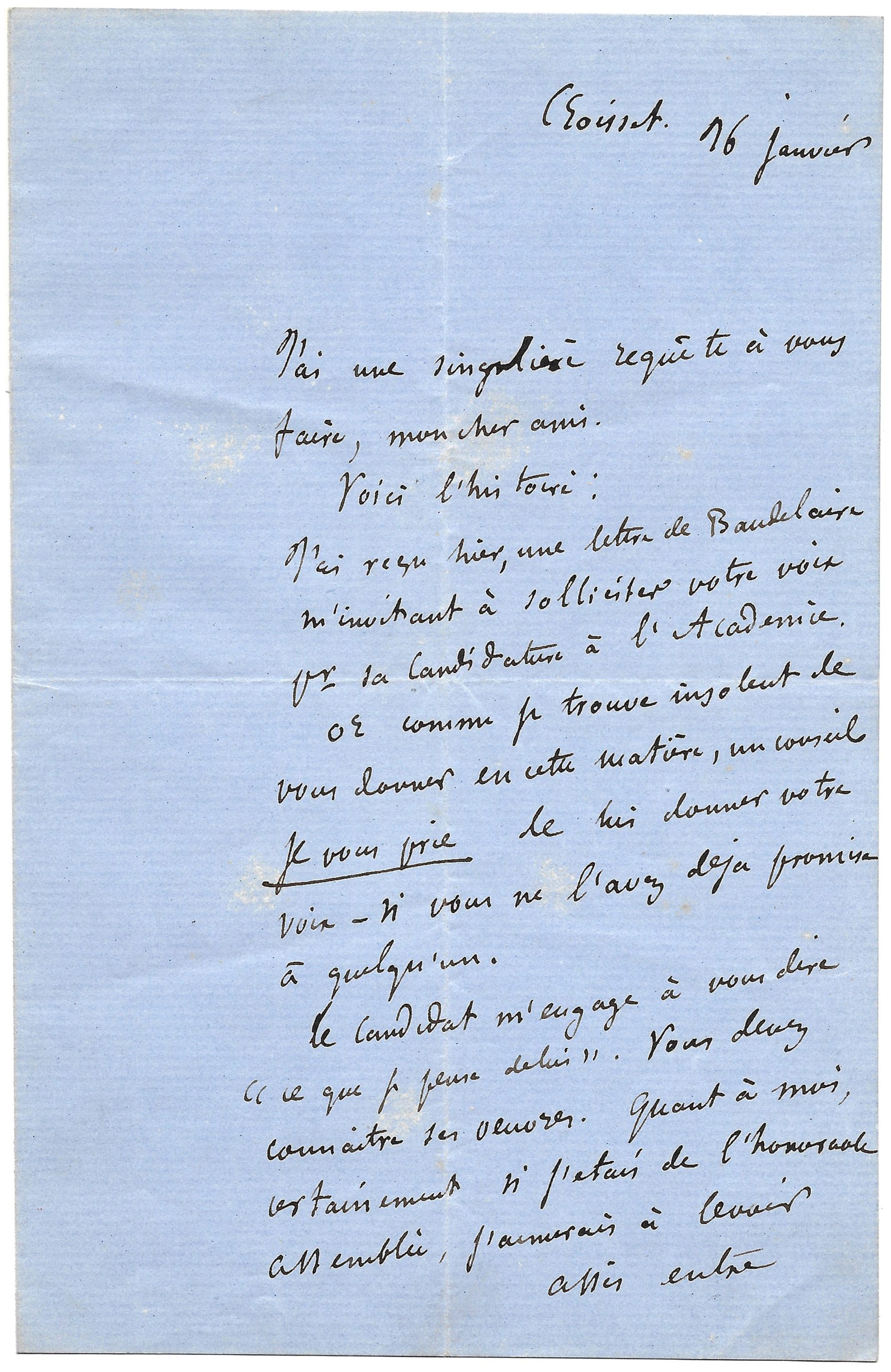 « Yesterday I received a letter from Baudelaire inviting me to ask for your voice for his candidacy to the Academy »
