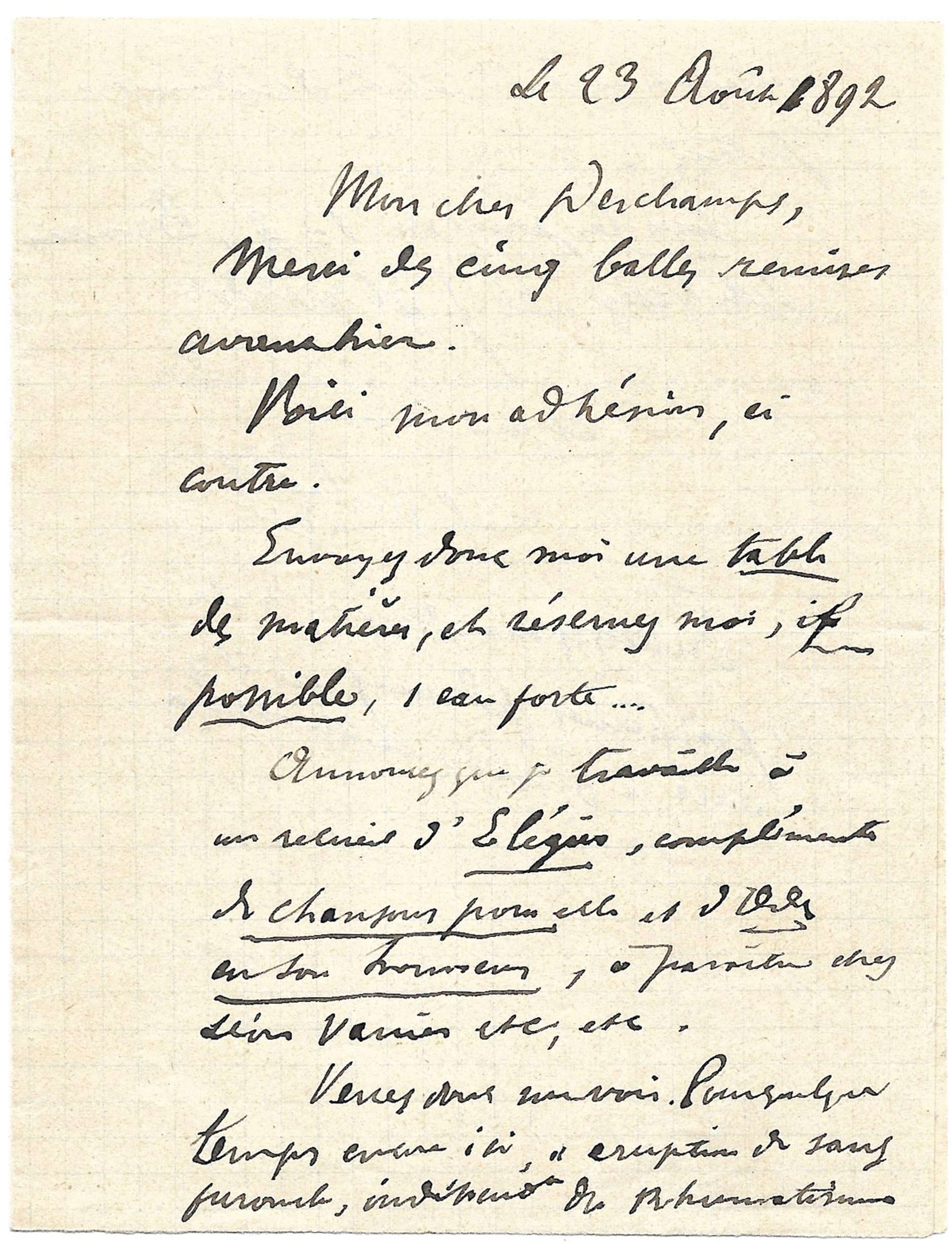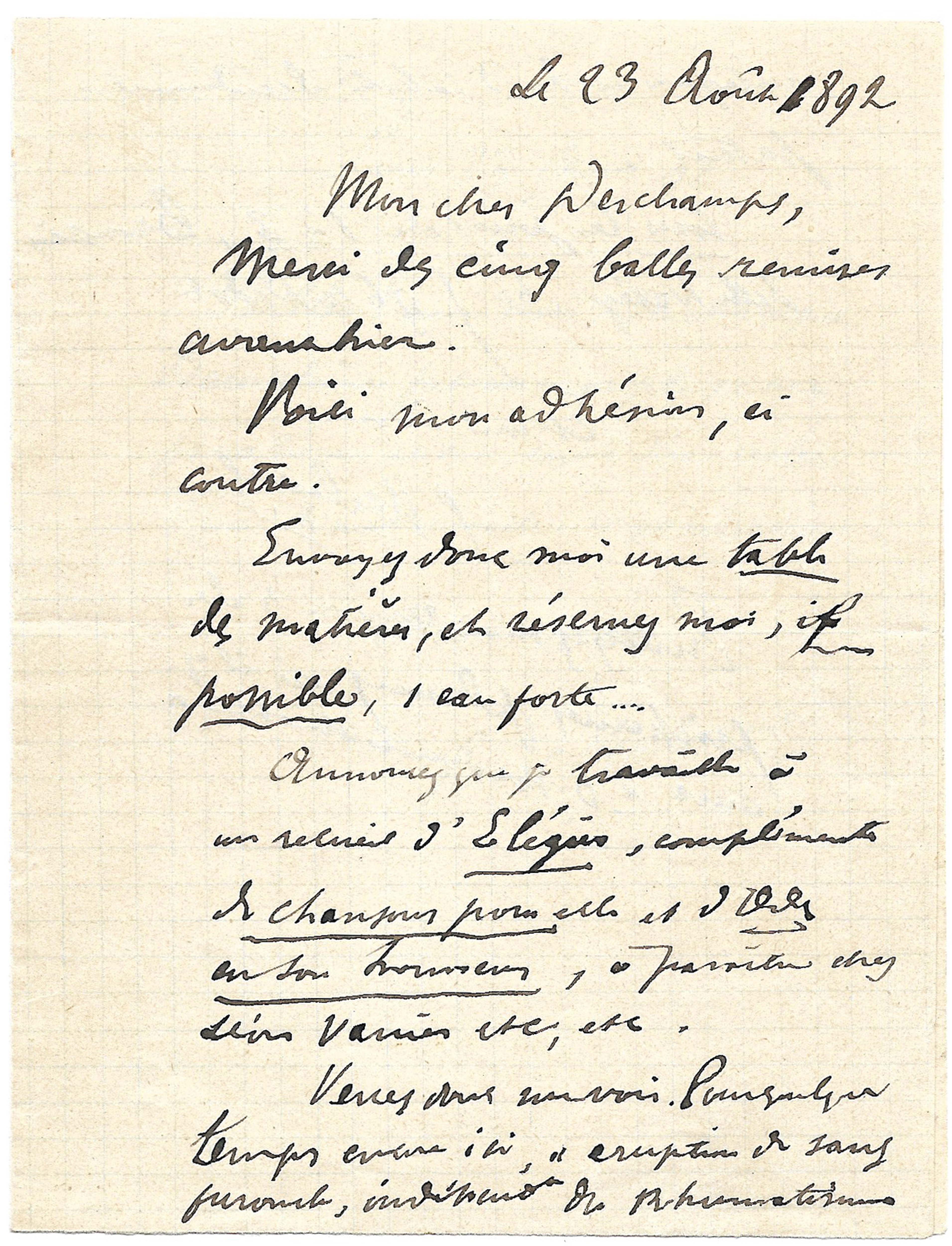 Verlaine agreed to participate in the subscription, despite his eternal financial worries. He adds in the letter to be working on his new poem collection Élégies (1893), a supplement to Chansons pour Elle (1891) and Odes en son honneur (1893), all collections inspired by his stormy and passionate relationships with his mistresses Philomène Boudin and Eugénie Krantz.