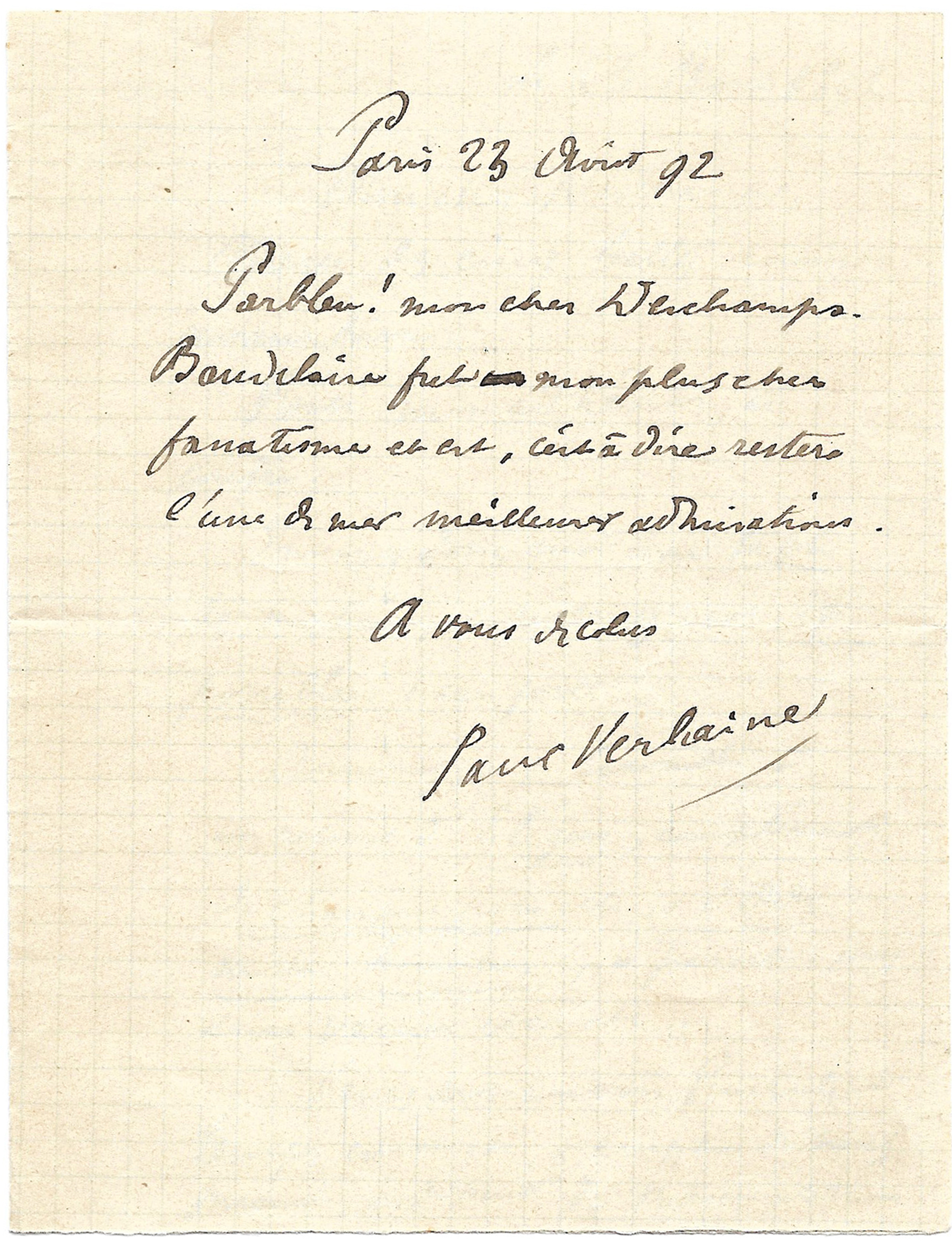 Autograph letter signed twice « Paul Verlaine » to Léon Deschamps