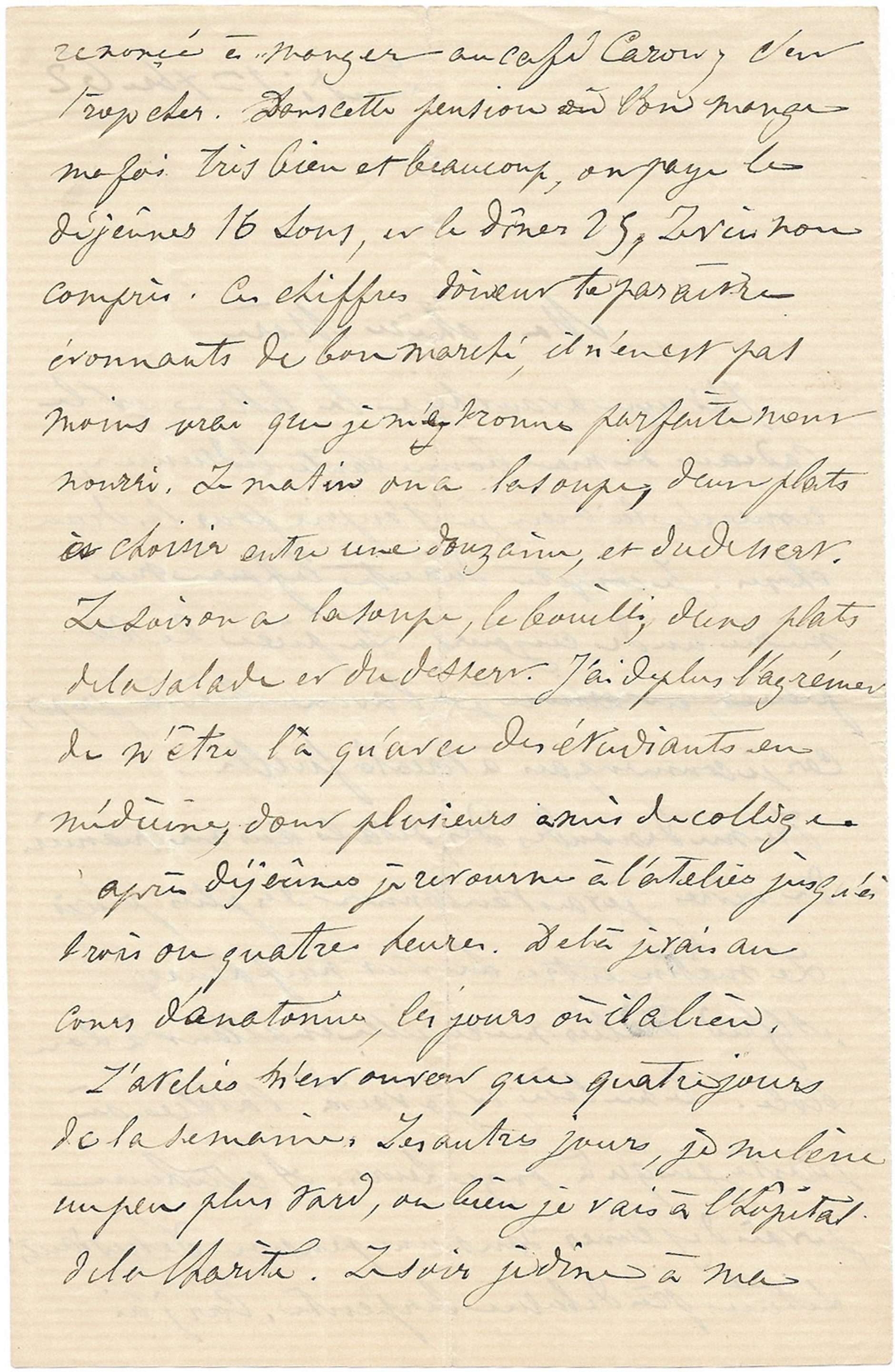 Tu me demandes des détails sur ma manière de vivre, je vais t’en donner des plus précis. Le matin, entre huit et neuf heures Alfred Parlier me réveille en allant à son école. Je me lève et je vais à l’atelier où je reste jusqu’à onze heures. À cette heure je vais déjeuner dans une pension d’étudiants située près de la sur Serpente. Car j’ai renoncé à manger au café Caron, c’est trop cher. Dans cette pension où l’on mange très bien et beaucoup, on paye le déjeuner 16 sous, et le dîner 25, le vin non compris. Ces chiffres doivent te paraître étonnants […]. J’ai de plus l’agrément de n’être là qu’à avec des étudiants en médecine, dont plusieurs amis de collège. Après le déjeuner je retourne à l’atelier jusqu’à trois ou quatre heures. De là je vais au cours d’anatomie les jours où il a lieu.