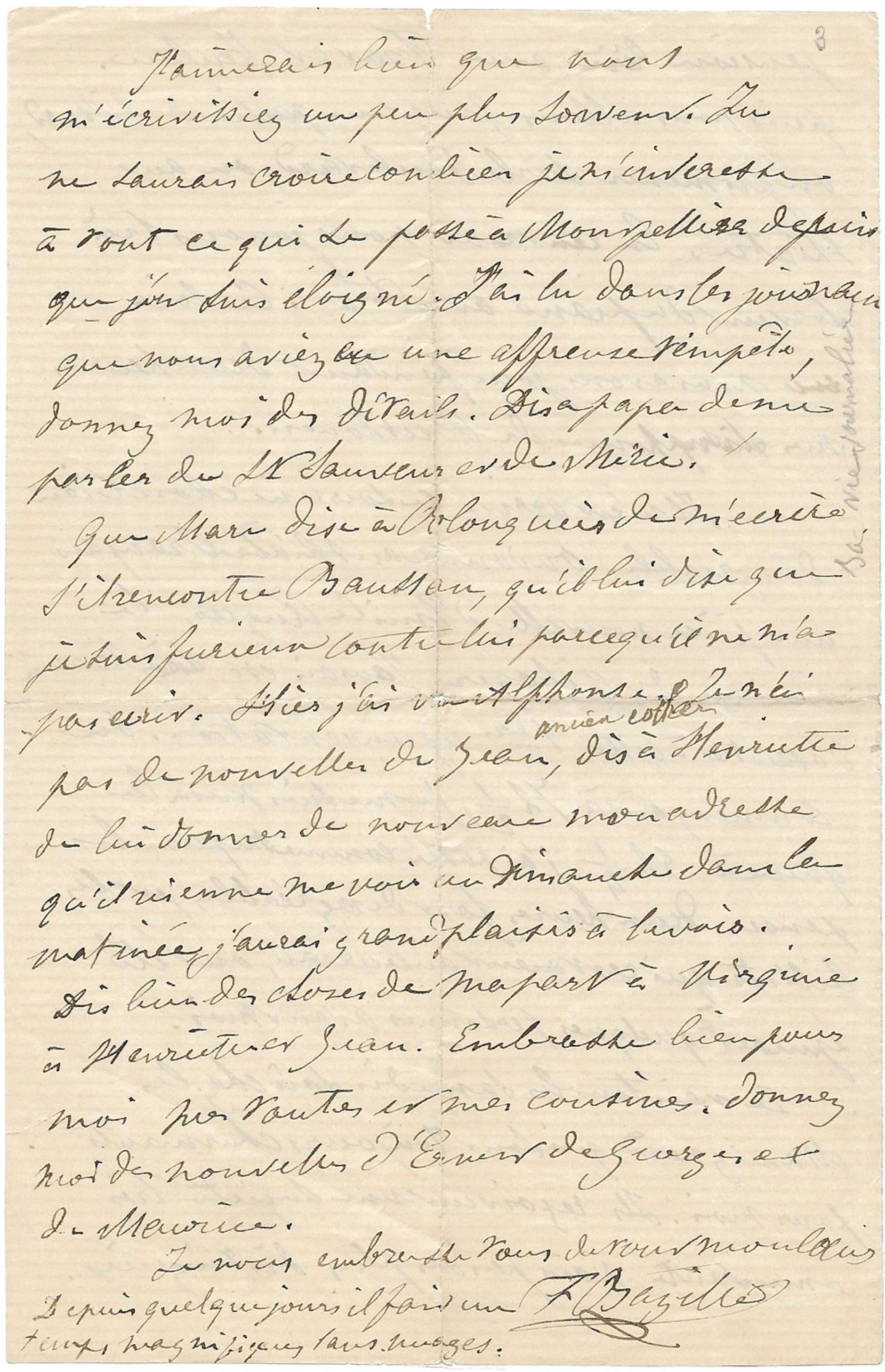 J’aimerais bien que vous m’écriviez un peu plus souvent. Tu ne saurais croire combien je m’intéresse à tout ce qui se passe à Montpellier depuis que j’en suis éloigné […]. Embrasse bien pour moi mes tantes et mes cousines. Donnez moi des nouvelles d’Ernest, de Georges et de Maurice.