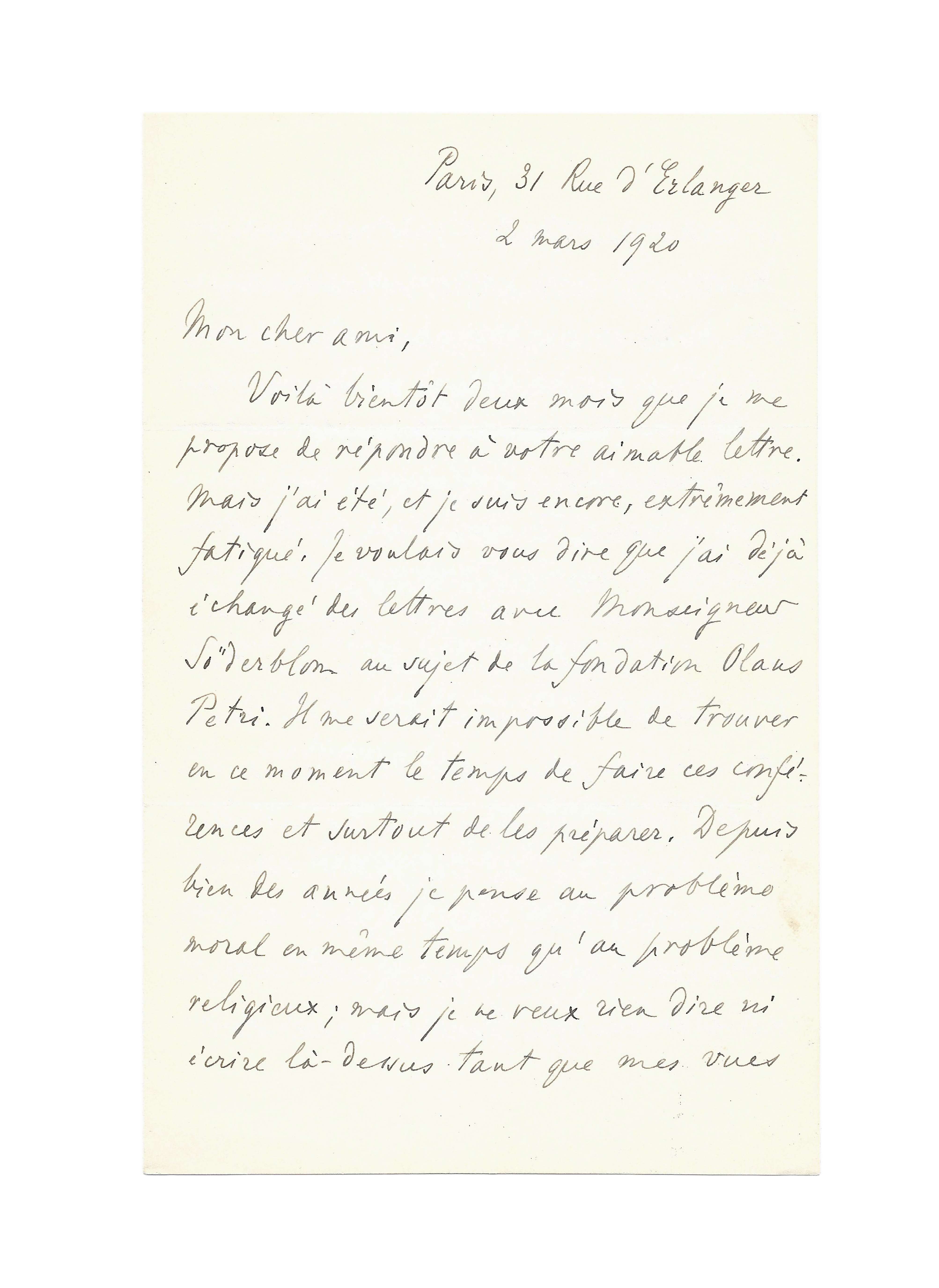 Voilà bientôt deux mois que je me propose de répondre à votre aimable lettre. Mais j’ai été, et je suis encore, extrêmement fatigué. Je voulais vous dire que j’ai déjà échangé des lettres avec Monseigneur Söderblom au sujet de la fondation Olaus Petri. Il me serait impossible de trouver en ce moment le temps de faire des conférences et surtout de les préparer. Depuis bien des années je pense au problème religieux ; mais je ne veux rien dire ni écrire là-dessus tant que mes vues ne seront pas tout à fait au point(1).
