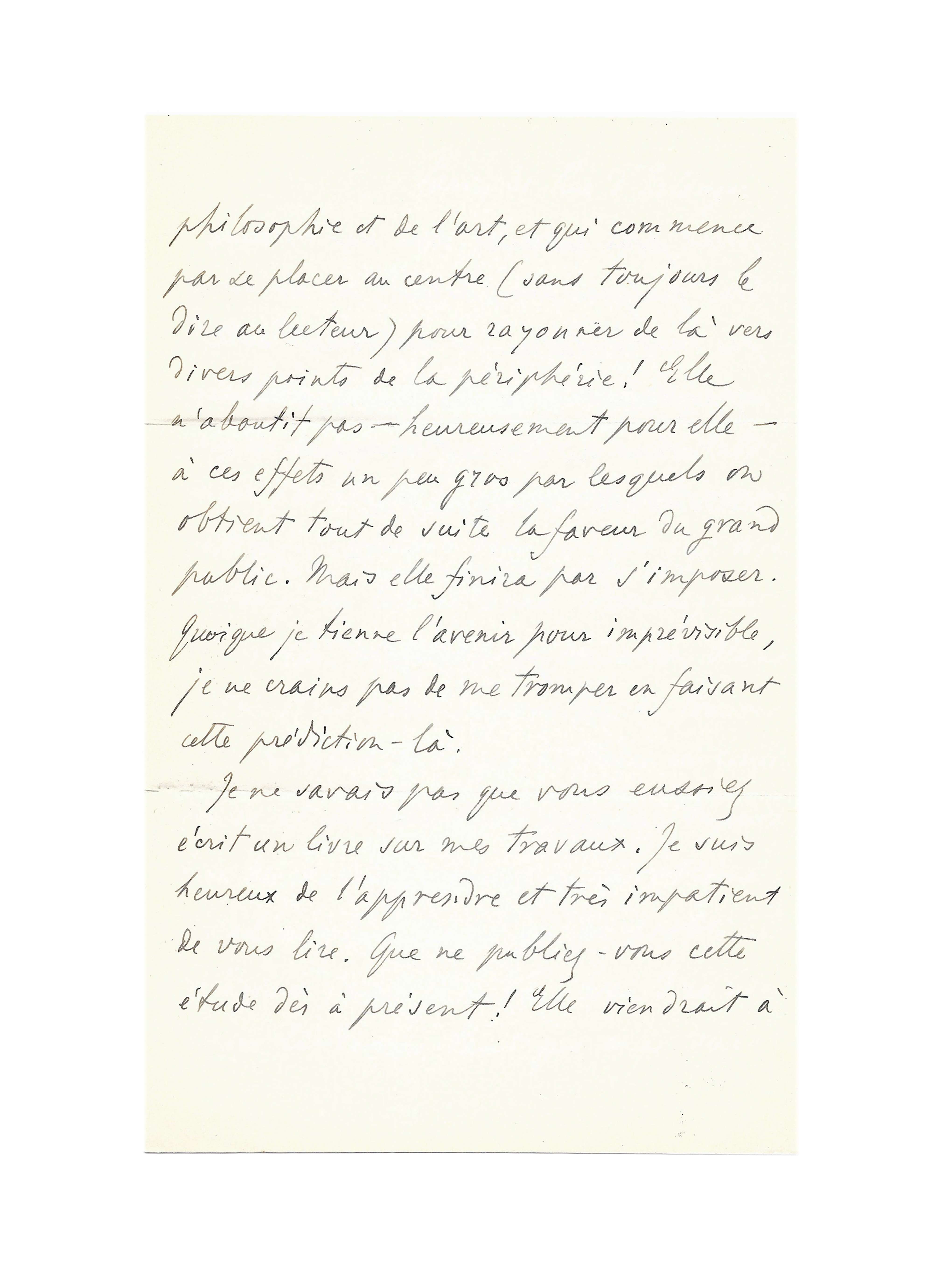Je vous sais toujours avec le plus grand intérêt. Récemment encore je lisais un article de vous sur Herbert Spencer(2) […]. Combien j’aime cette critique par le dedans, qui participe de la philosophie et de l’art(3), et qui commence par se placer au centre (sans toujours le dire au lecteur) pour rayonner de là vers divers points de la périphérie !Elle n’aboutit pas – heureusement pour elle – à ces effets un peu gros par lesquels on obtient tout de suite la faveur du grand public. Mais elle finira par s’imposer.