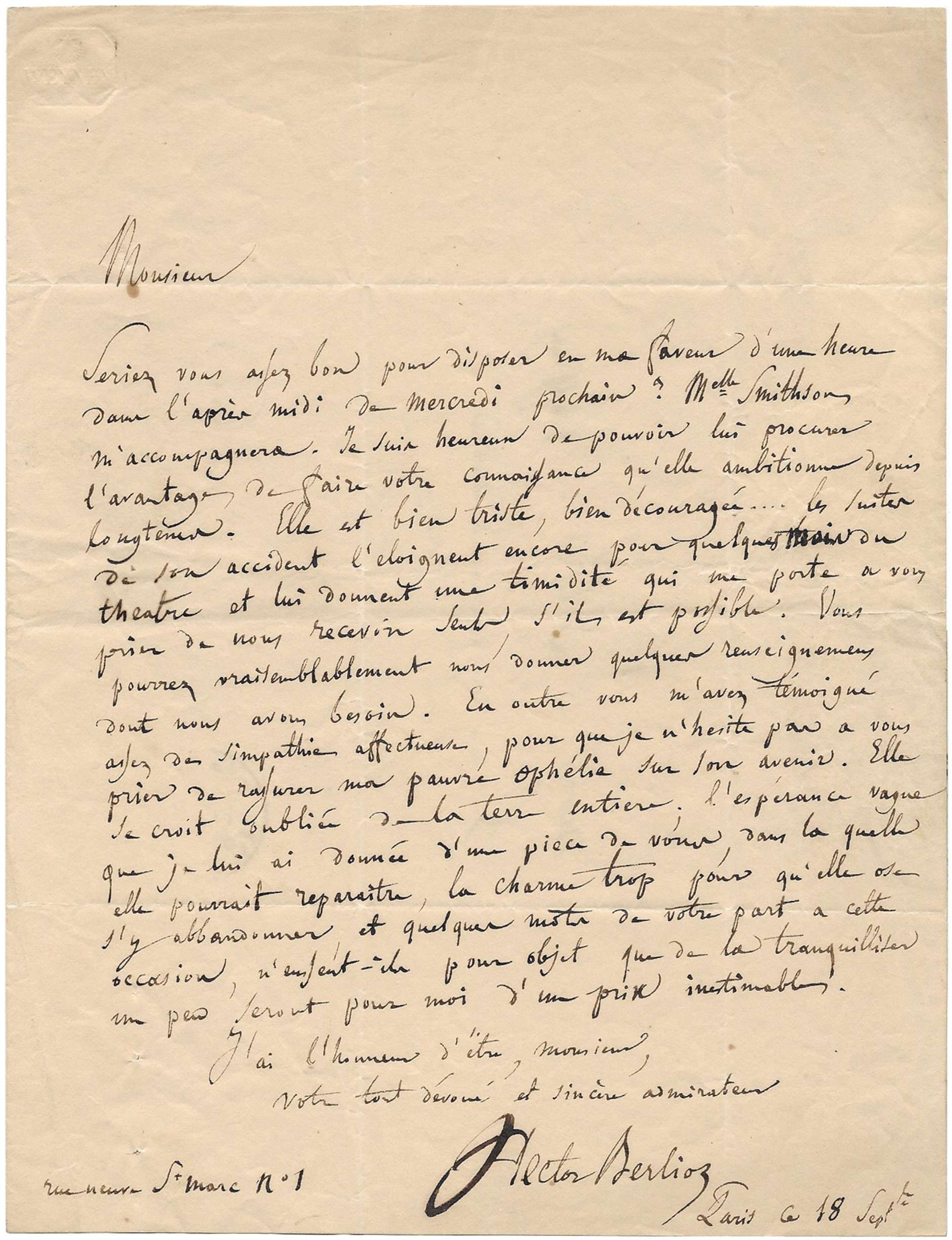 Autograph letter signed « Hector Berlioz » to Alfred de Vigny
