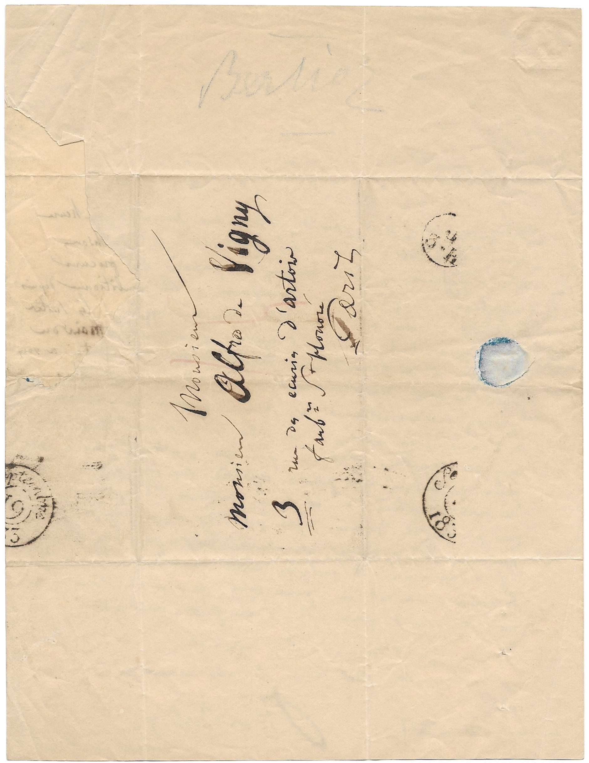 Aut. address: « Monsieur Alfred de Vigny / 3 rue des écuries d’Artois / Faubg St Honoré / Paris »