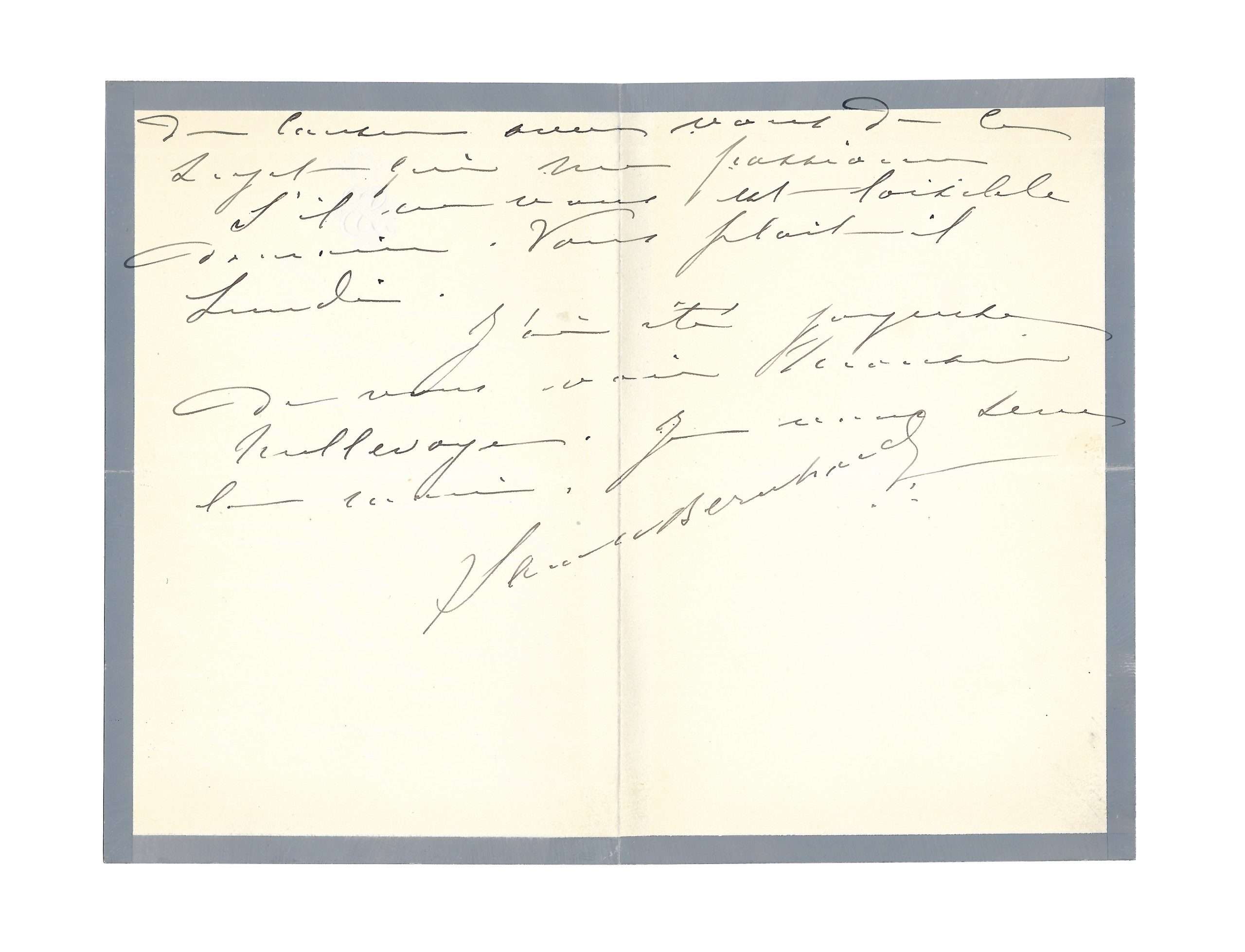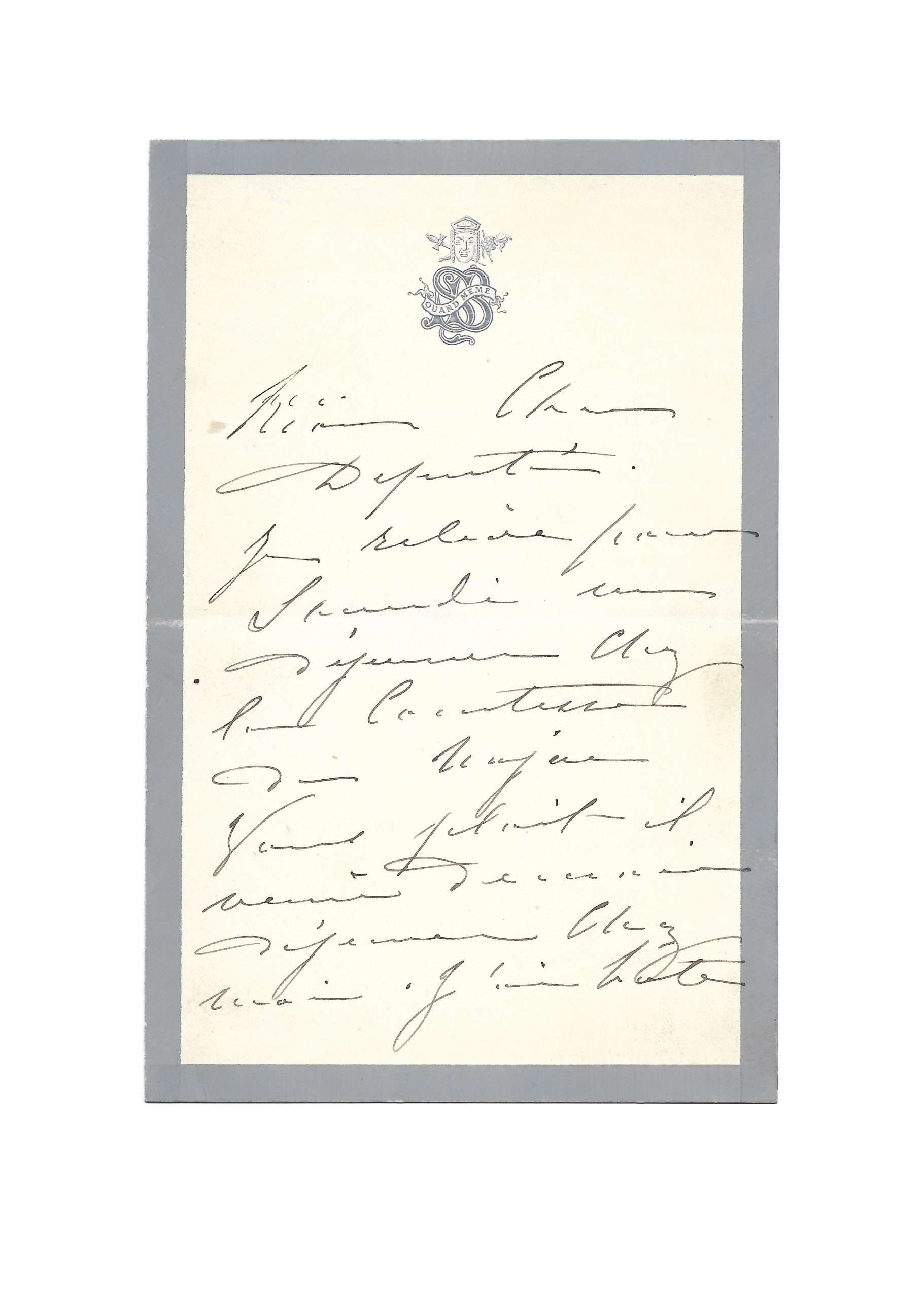 “Très cher député, je réserve pour samedi un déjeuner chez la Comtesse de Najac. Vous plaît-il demain venir chez moi. J’ai hâte de causer avec vous de ce sujet qui me passionne. S’il ne vous est possible demain, vous plaît-il lundi. J’ai été joyeuse de vous voir…. Je vous serre la main.