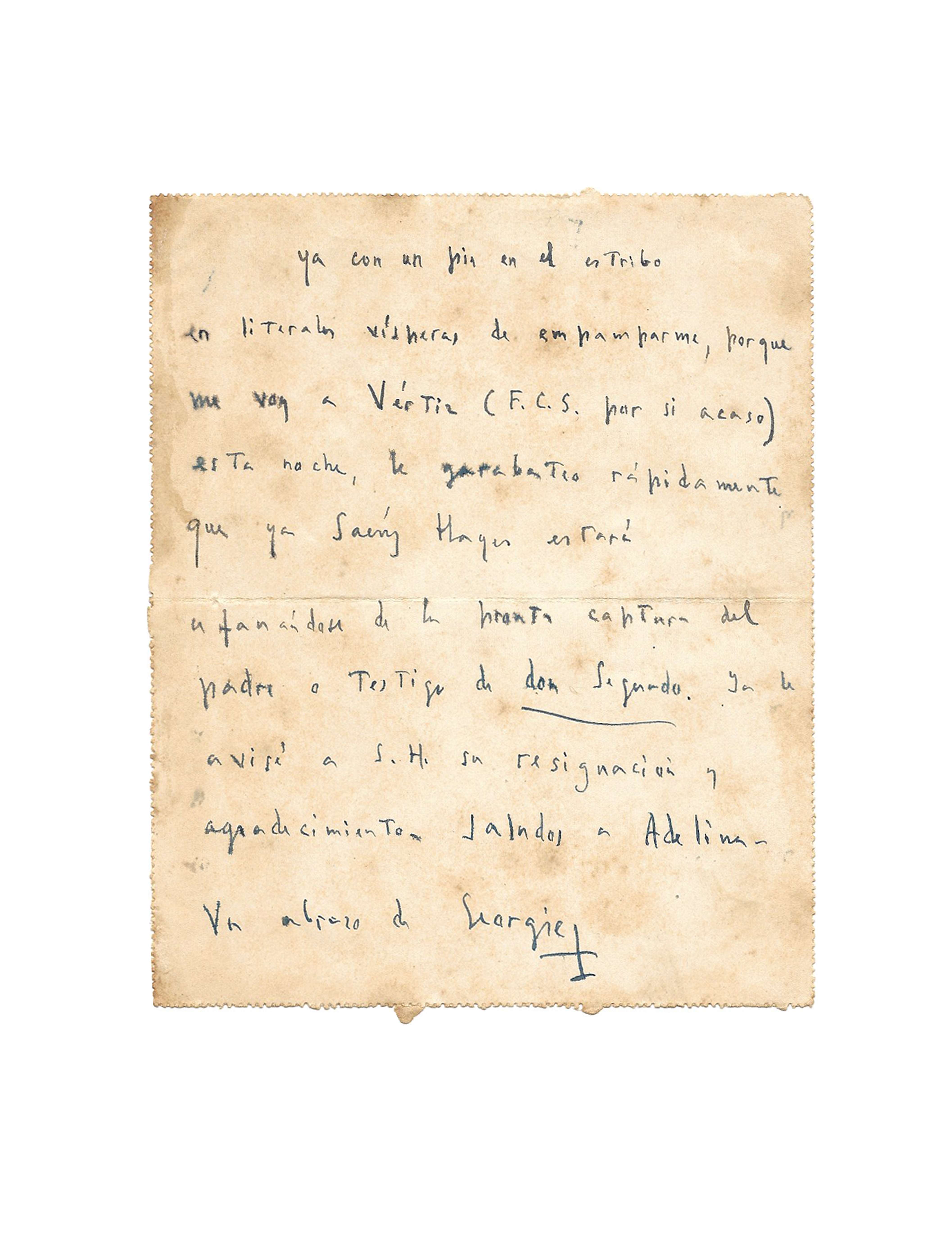 «Ya con un pie en el estribo en literales vísperas de empamparme, porque me voy a Vértiz (F.C.S. por si acaso) esta noche, le garabateo rápidamente que ya Sáenz Hayes estará ufanándose de la pronta captura del padre o testigo de Don Segundo. Ya le avisé à S.H. su resignación y agradecimiento…»