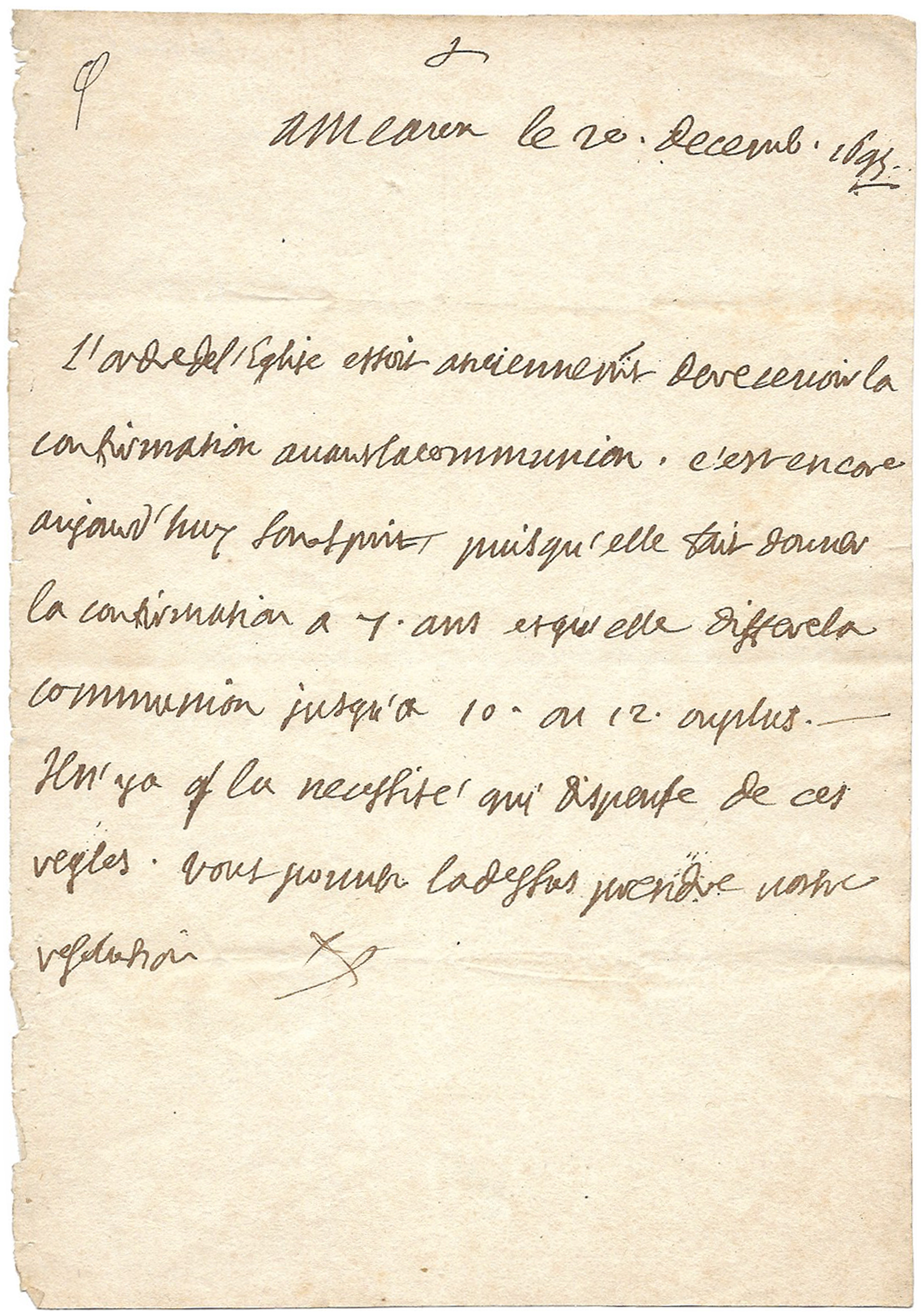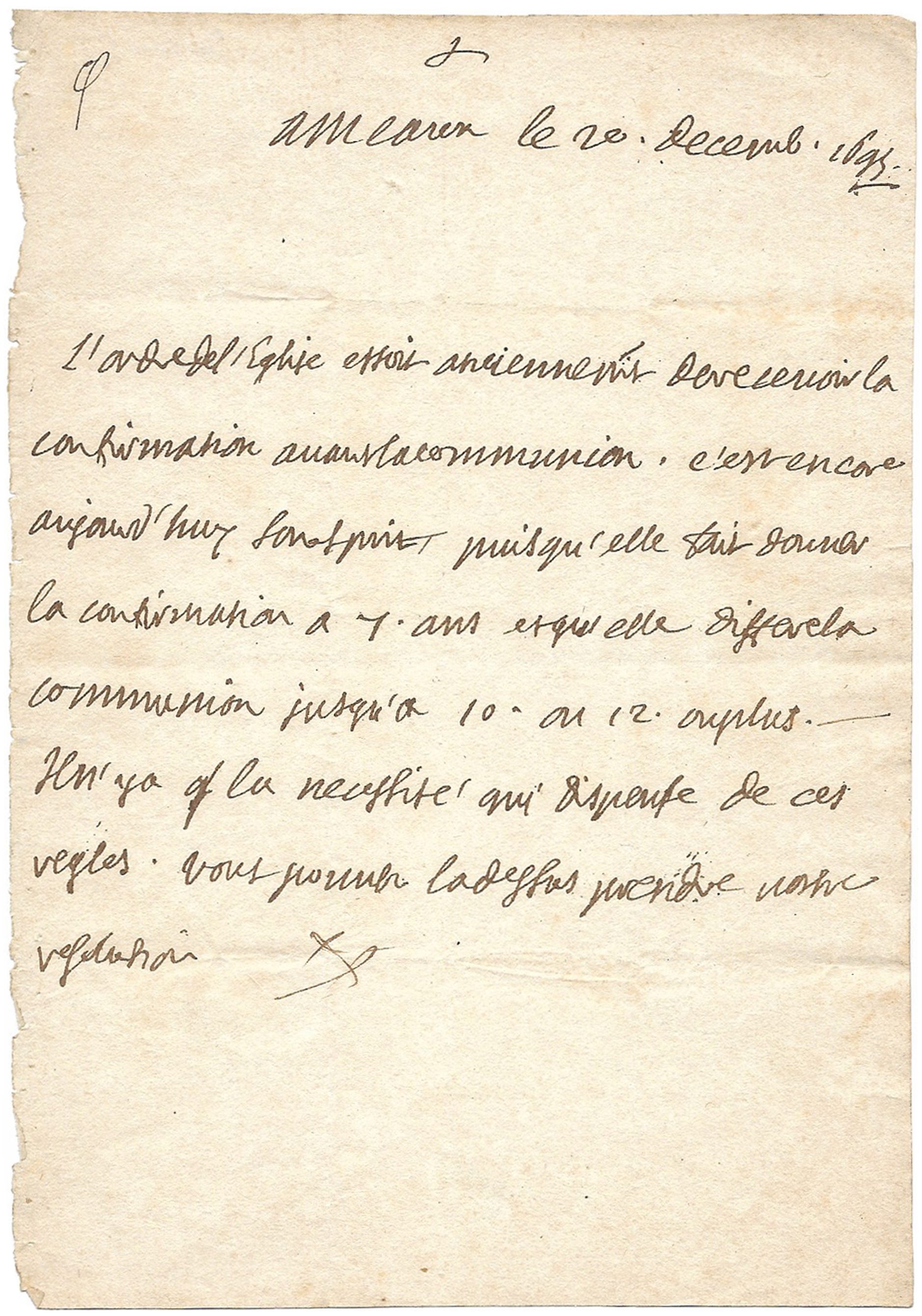 « L’ordre de l’église estoit anciennement de recevoir la confirmation avant la communion ; c’est encore aujourd’huy son esprit, puisqu’elle fait donner la confirmation a 7 ans et qu’elle diffère la communion jusqu’à 10 ou 12, ou plus. Il n’y a que la nécessité qui dispense ces règles. Vous pouvez là-dessus prendre vostre résolution. »