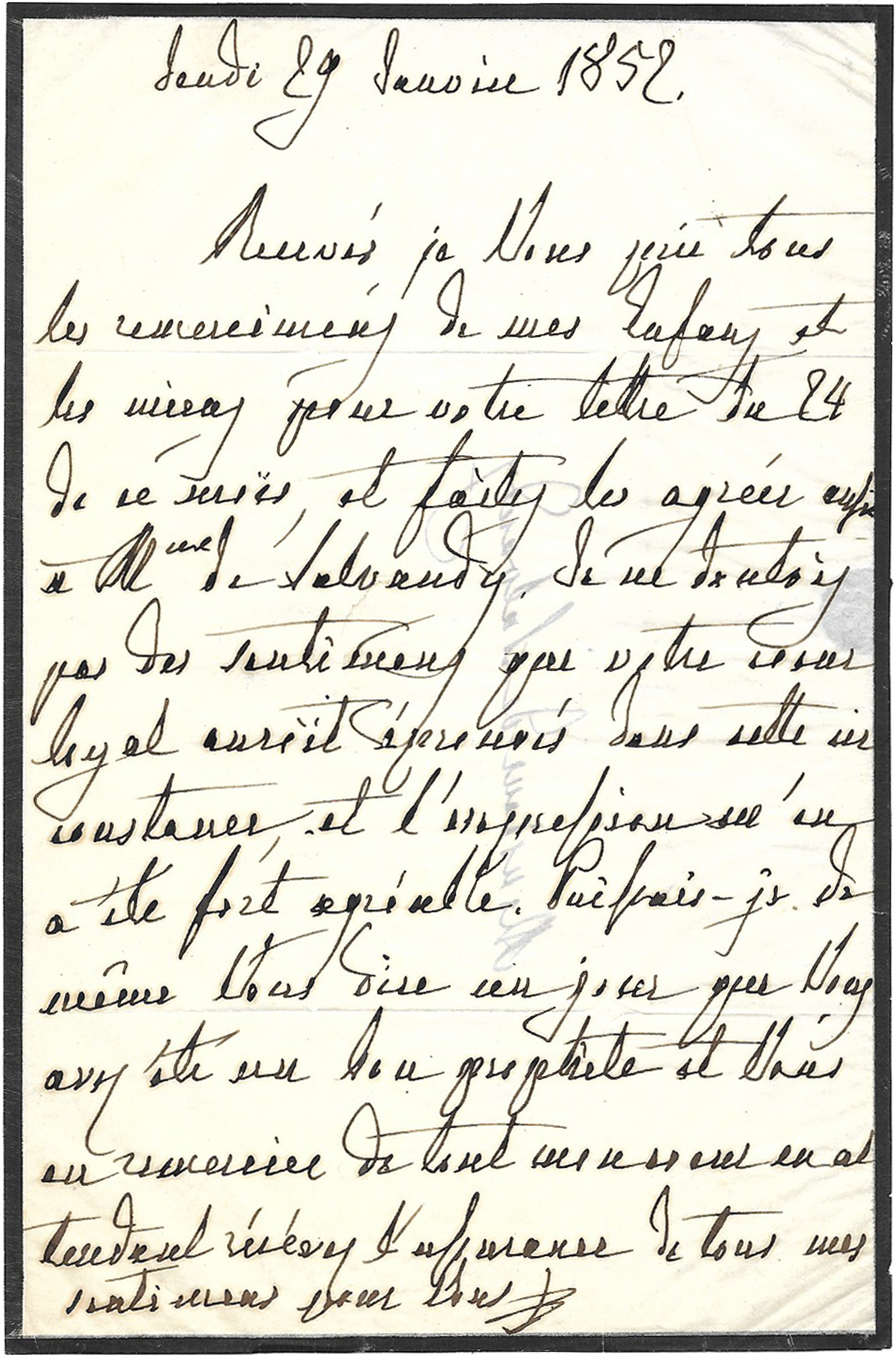 « Recevez, je vous prie tous les remerciements de mes enfants, et les miens pour votre lettre du 24 de ce mois, et faites les agréer enfin à Mme de Salvandy. Je ne doutais pas des sentiments que votre cœur loyal aurait éprouvés dans cette circonstance, et l’expression m’en a été fort agréable. Puissais-je [sic] de même vous dire un jour que vous avez été un bon prophète et vous en remercier de tout mon cœur. En attendant recevez l’assurance de tous mes sentiments pour vous.