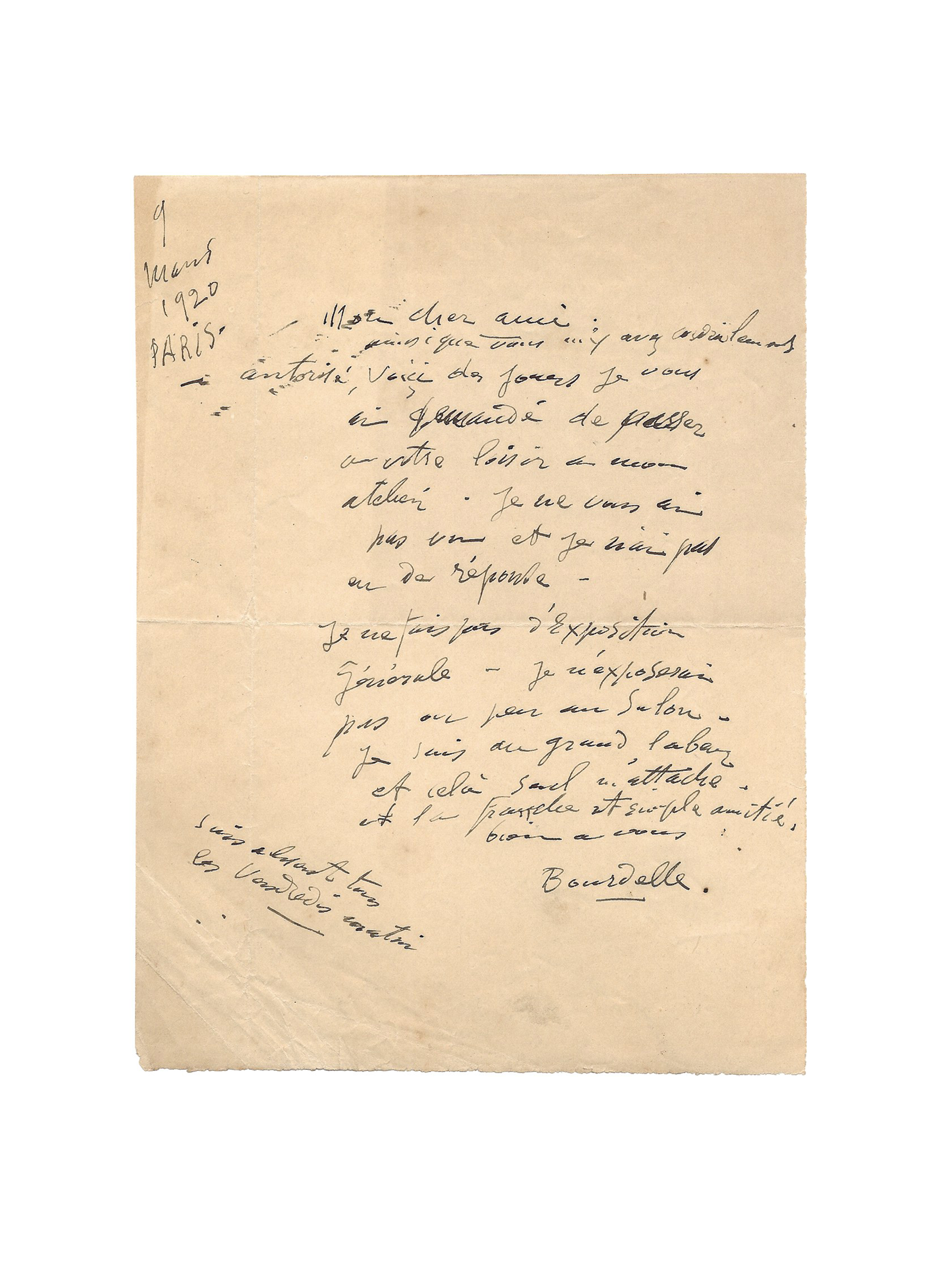 Autograph letter signed « Bourdelle » to M. Thiebaut-Sissou