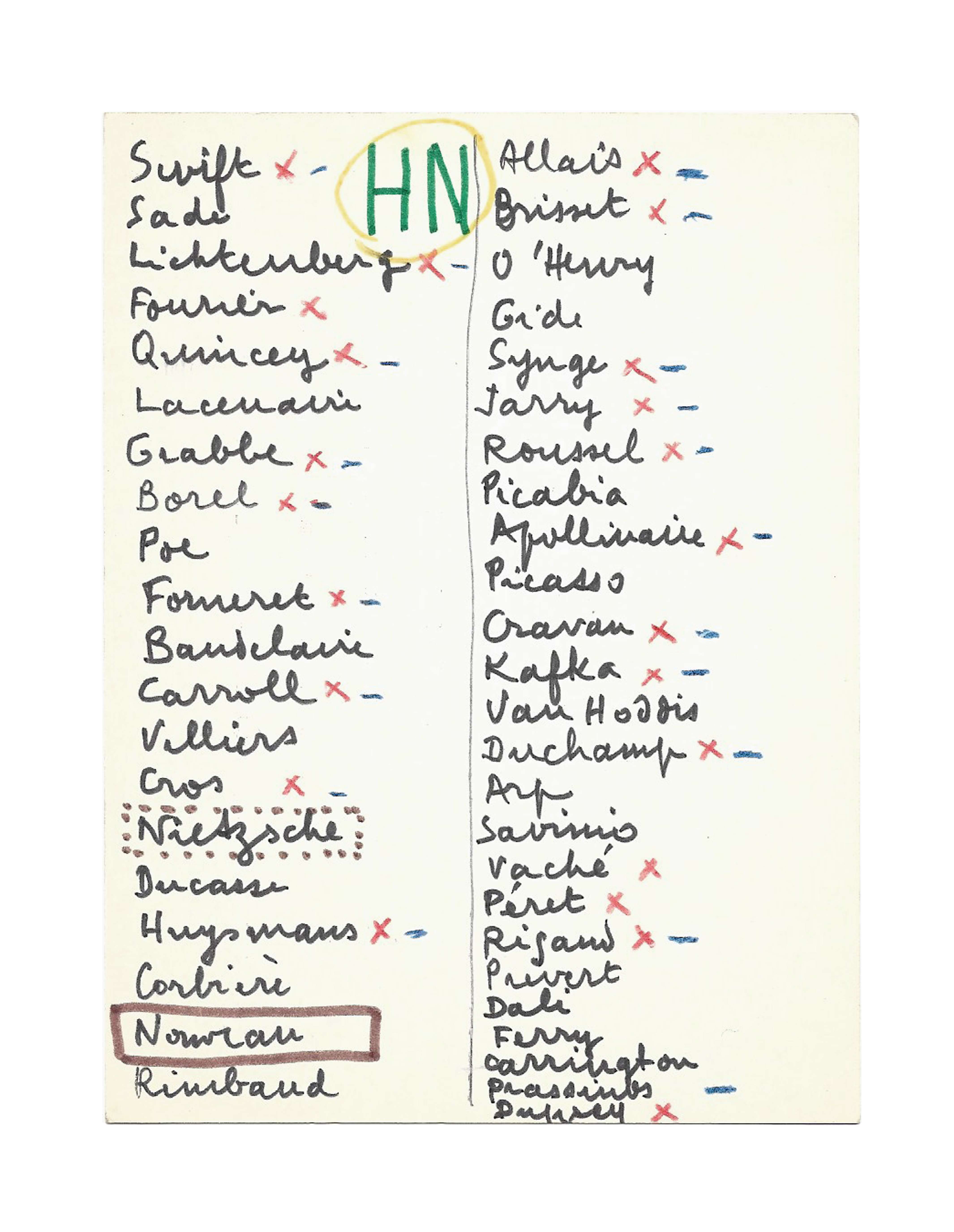 « Swift / Sade… Nietzsche… Corbière / Nouveau / Rimbaud… Picabia / Apollinaire / Picasso… Kafka… Duchamp… Vaché… Prévert / Dalí » etc.