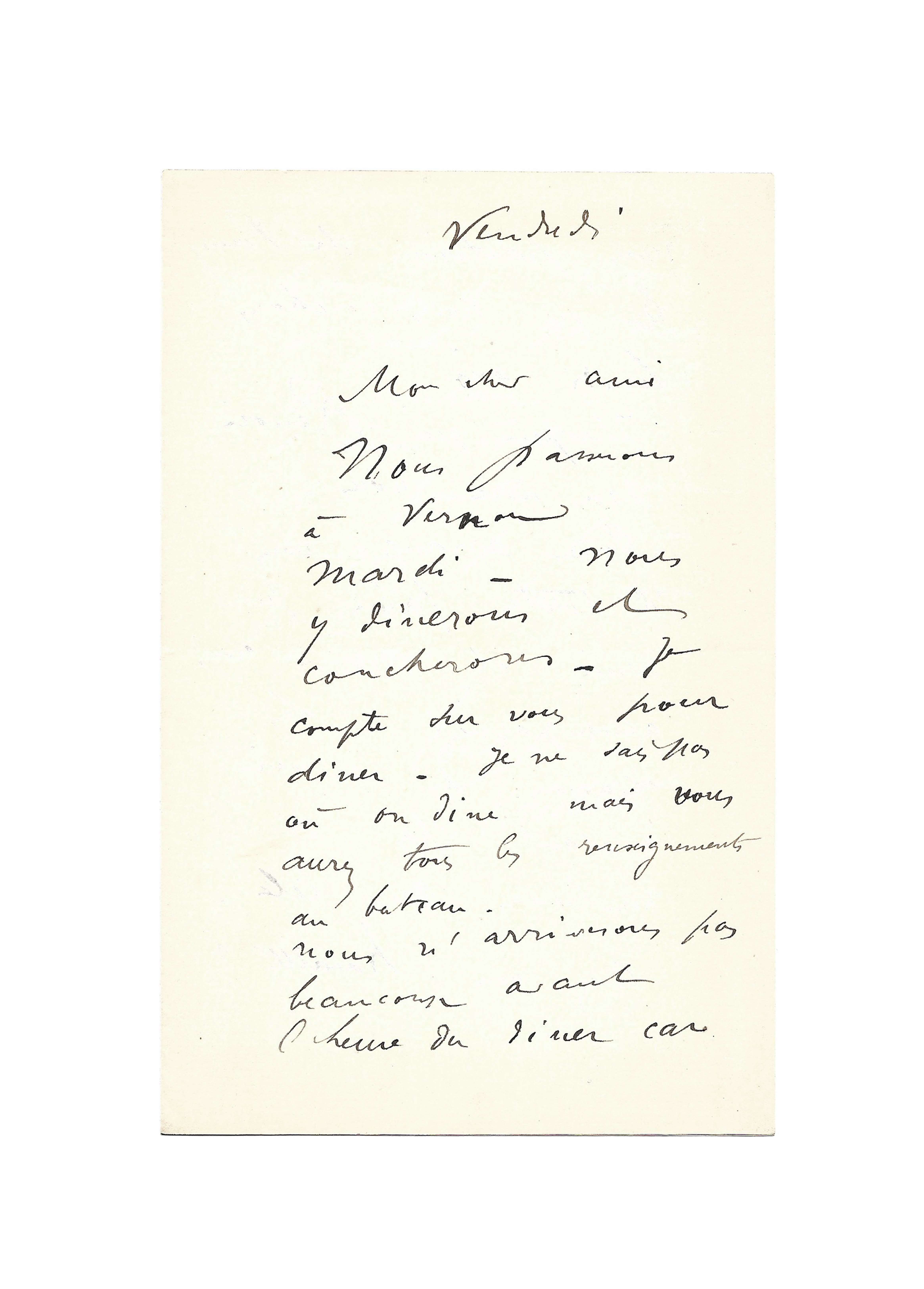 Nous passerons à Vernon mardi – nous y dînerons – Je compte sur vous pour diner.