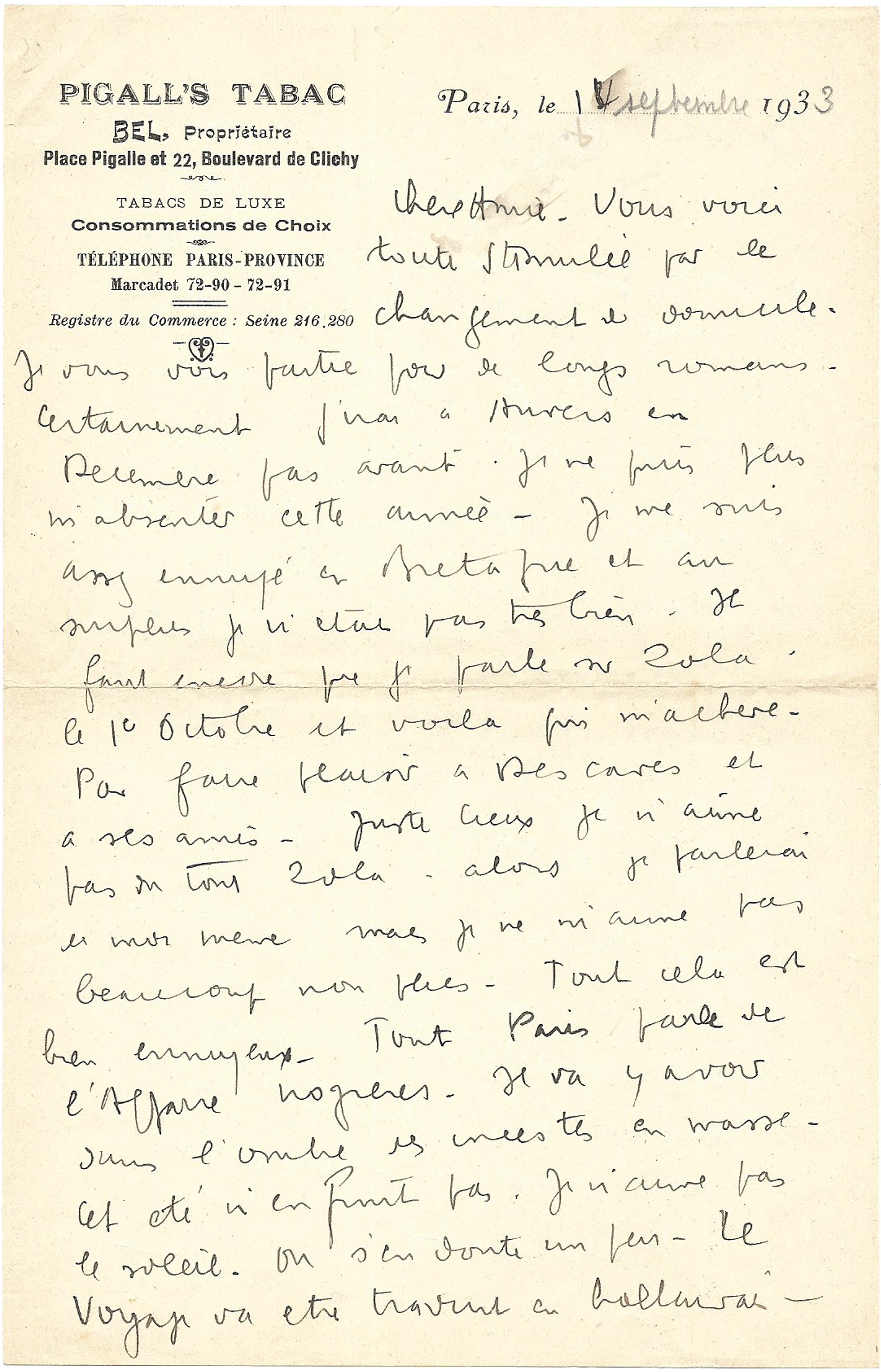 Vous voici toute stimulée par le changement de domicile. Je vous vois partie pour de longs romans. Certainement j’irai à Anvers en décembre, pas avant. Je ne puis plus m’absenter cette année. Je me suis assez ennuyé en Bretagne et au surplus je n’étais pas très bien. Il faut encore que je parle sur Zola le 1er octobre et voilà qui m’achève. Pour faire plaisir à Descaves et à ses amis. Juste cieux je n’aime pas du tout Zola, alors je parlerai de moi-même mais je n’aime pas beaucoup non plus. Tout cela est bien ennuyeux. Tout Paris parle de l’Affaire Nozières¹ [sic]. Il va y avoir dans l’ombre des incestes en masse. Cet été n’en finit pas. Je n’aime pas le soleil. On s’en doute un peu. Le Voyage va être traduit en hollandais.