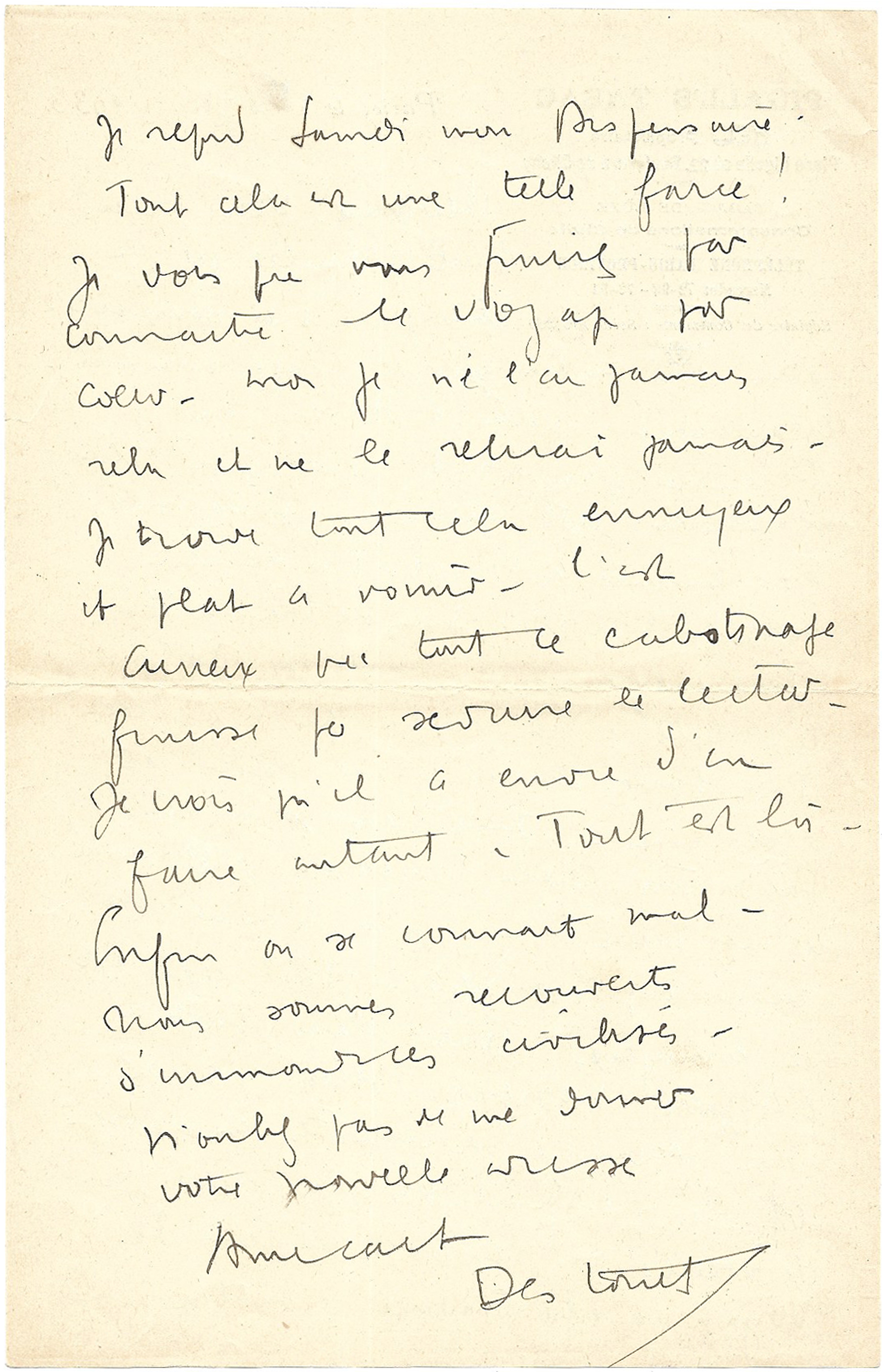 Je vois que vous finirez par connaître le Voyage par cœur. Moi je ne l’ai jamais relu et ne le relirai jamais. Je trouve tout cela ennuyeux et plat à vomir. C’est curieux que tout ce cabotinage finisse par séduire le lecteur. Je crois qu’il a envie d’en faire autant. Tout es là. Enfin on se connaît mal. Nous sommes recouverts d’immondices civilisés. N’oubliez pas de me donner votre nouvelle adresse.