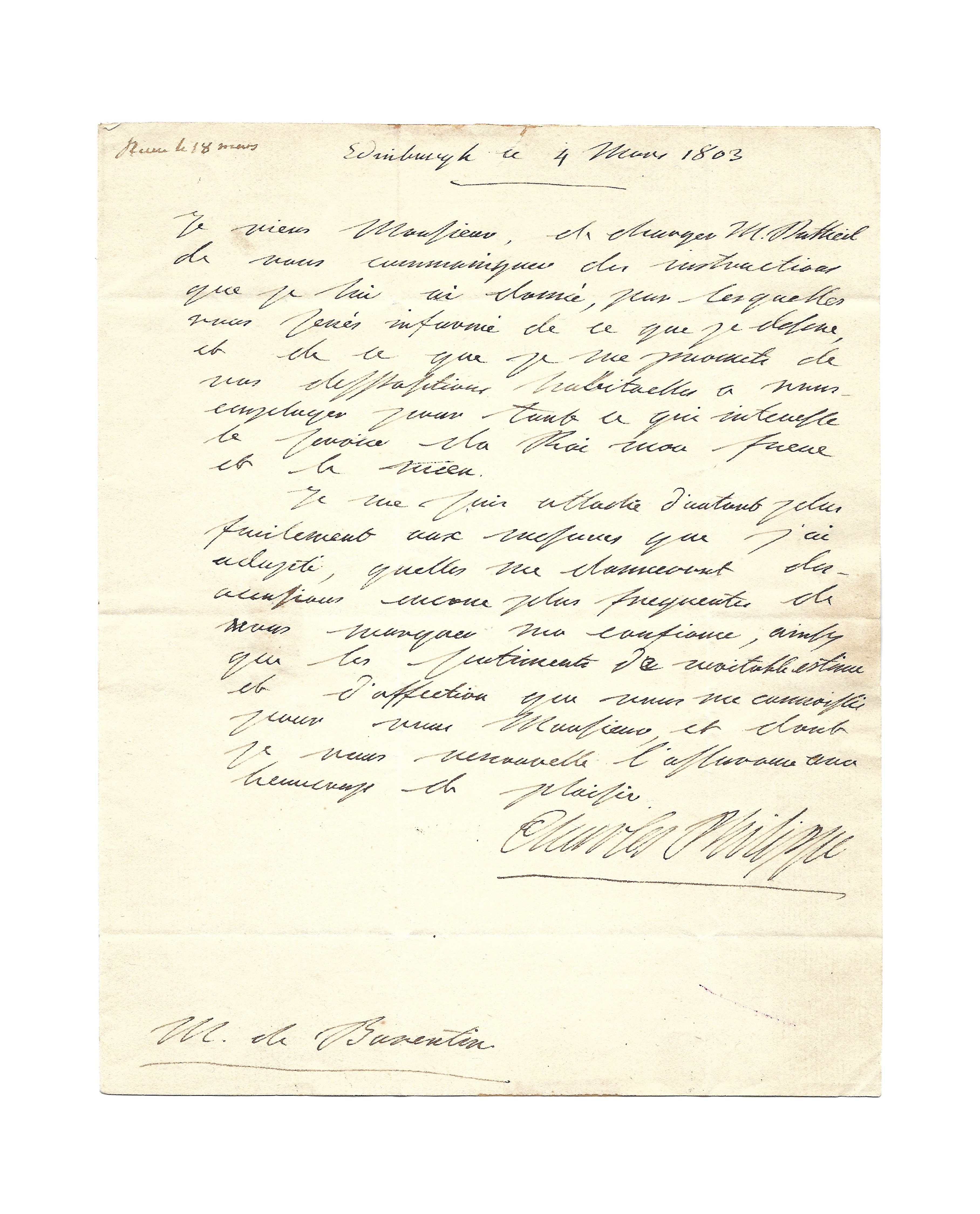 “Je viens Monsieur, de charger M. Dutheil de vous communiquer des instructions que je lui ai donné, par lesquelles vous serés informé de ce que je desire, et de ce que je me promets de nos dispositions habituelles a vous employer pour tout ce qui interesse le service du Roi mon frere [le futur Louis XVIII] et le mien. Je me suis attaché d’autant plus facilement aux mesures que j’ai adopté, quelles me donneront des occasions encore plus frequentes de vous marquer ma confiance, ainsy que les sentiments de veritable estime et d’affection que vous me connoissés pour vous Monsieur, et dont je vous renouvelle l’assurance avec beaucoup de plaisir.