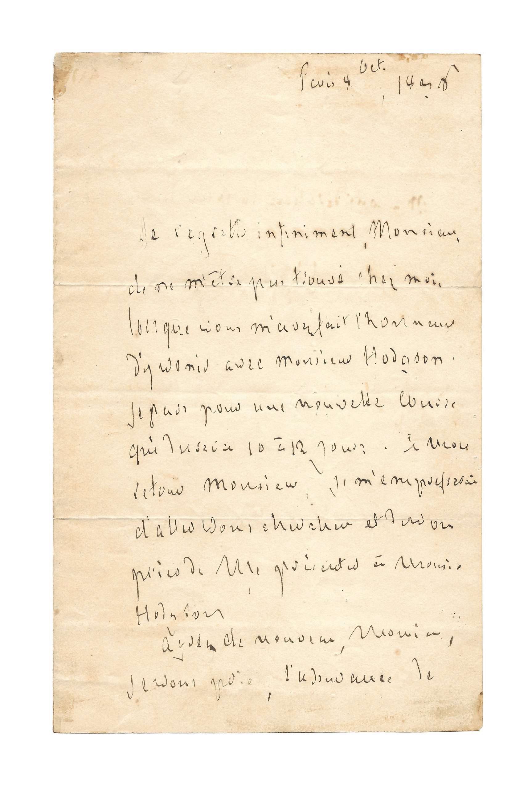 “Je regrette infiniment, Monsieur, de ne m’être pas trouvé chez moi, lorsque vous m’avez fait l’honneur d’y venir avec monsieur [Francis] Hodgson. Je pars pour une nouvelle course qui durera 10 à 12 jours. À mon retour monsieur, je m’empresserai d’aller vous chercher et de vous prier de me présenter à monsieur Hodgson.