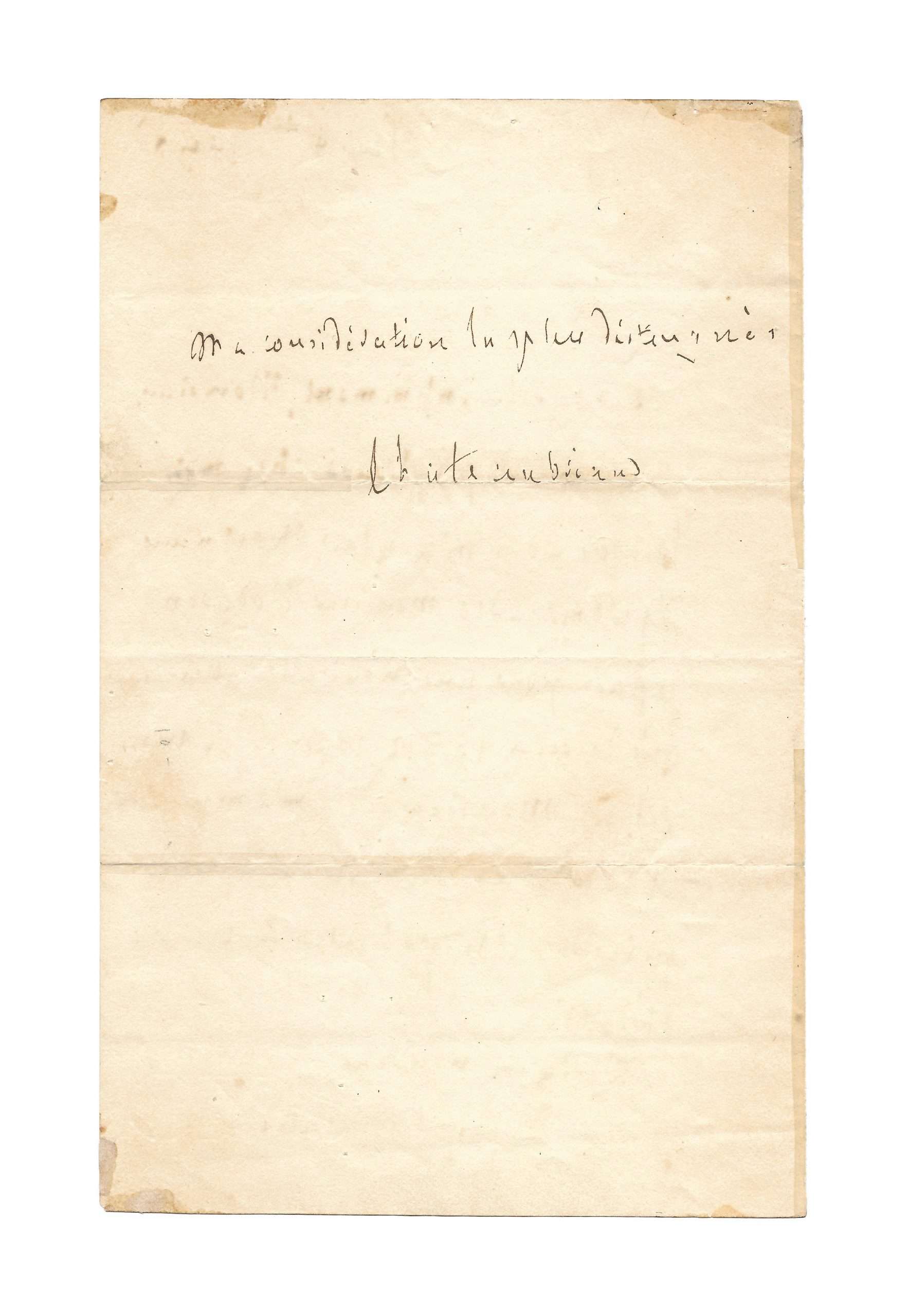 Agréez de nouveau, Monsieur, le vous prie, l’assurance de ma considération la plus distinguée.