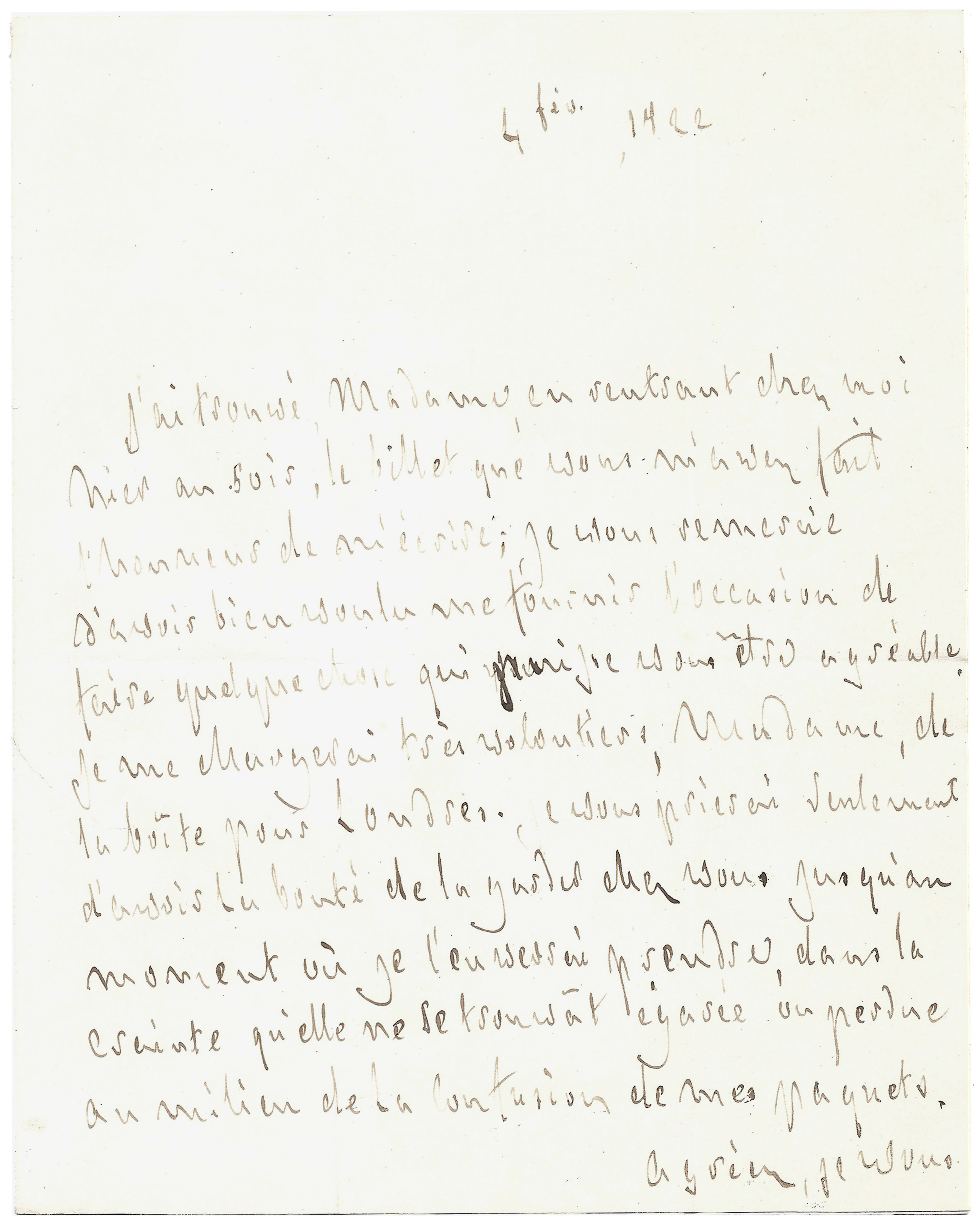 “J’ai trouvé, Madame, en rentrant chez moi hier soir, le billet que vous m’aviez fait l’honneur de m’écrire ; je vous remercie d’avoir bien voulu me fournir l’occasion de faire quelque chose qui puisse vous être agréable. Je me chargerai très volontiers, Madame, de la boite pour Londres. Je vous prierai seulement d’avoir la bonté de la garder chez vous jusqu’au moment où je l’enverrai prendre, dans la crainte qu’elle ne se trouvât égarée ou perdue au milieu de toute la confusion de mes paquets.
