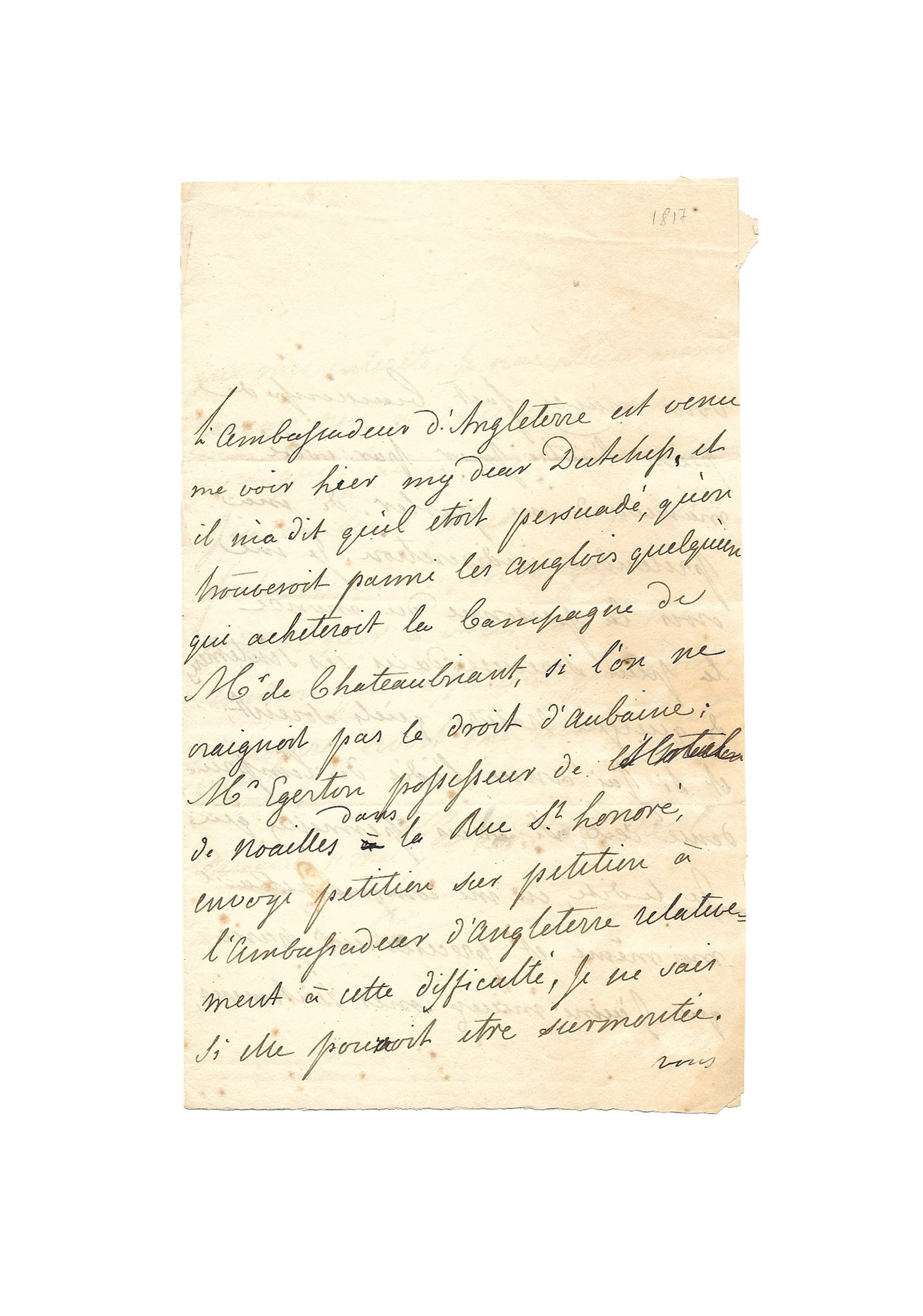 « L’ambassadeur d’Angleterre est venu me voir hier, my dear dutchess, et il m’a dit qu’il était persuadé qu’on trouverait parmi les Anglais quelqu’un qui achèterait la campagne de M. de Chateaubriant [sic] si l’on ne craignait pas le droit d’aubaine ; M. Egerton, possesseur de l’hôtel de Noailles dans la rue Saint-Honoré envoie pétition sur pétition à l’ambassadeur d’Angleterre relativement à cette difficulté, je ne vois si elle pourrait être surmontée.