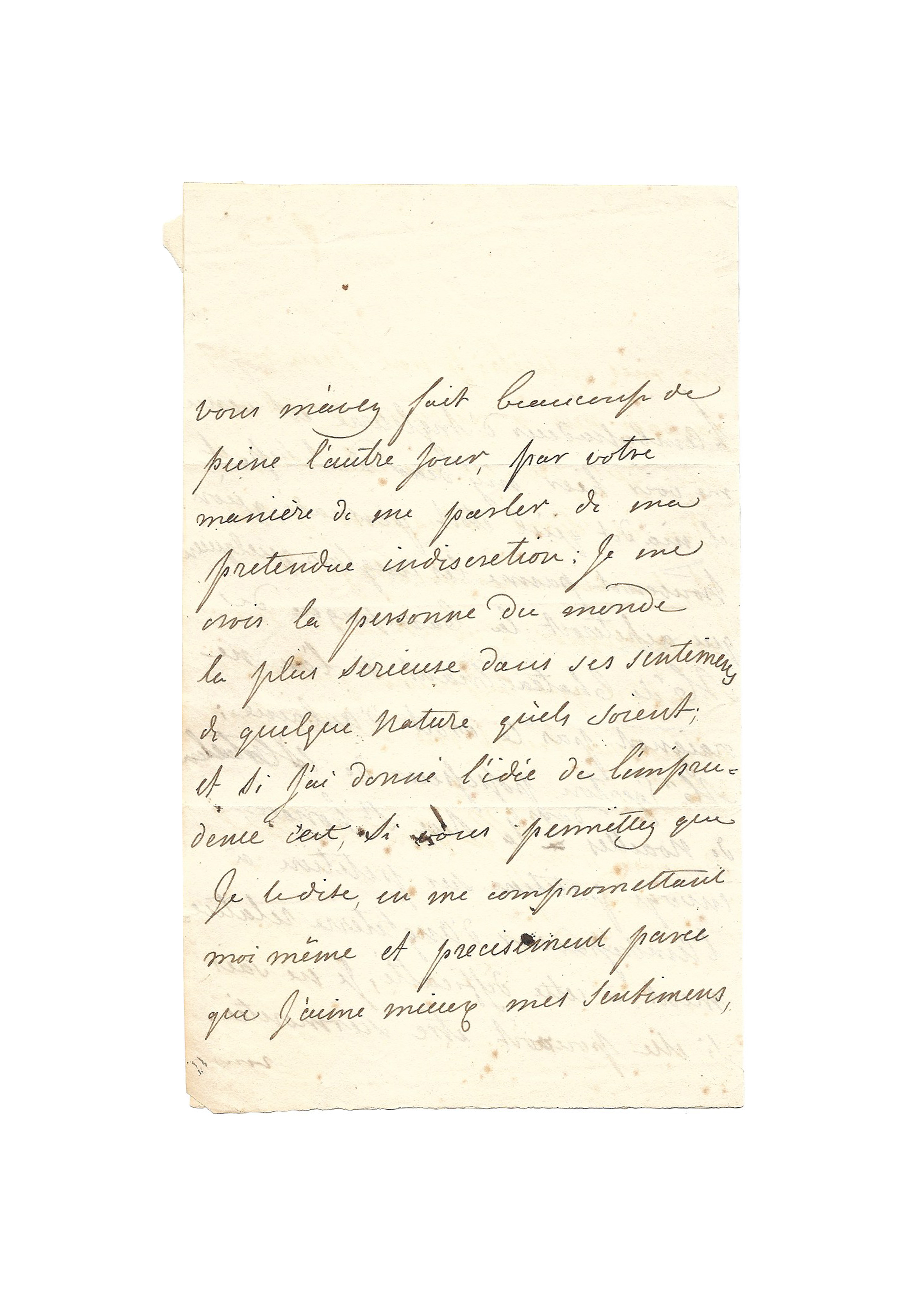 Vous m’avez fait beaucoup de peine l’autre jour par votre manière de me parler de ma prétendue indiscrétion. Je me crois la personne du monde la plus sérieuse dans ses sentiments de quelque nature qu’ils soient ; et si j’ai donné l’idée de l’imprudence c’est si vous permettez que je le dise en me compromettant moi-même et précisément parce que j’aime mieux mes sentiments que mes intérêts ; je n’ai, Dieu merci, jamais nui à aucune personne avec qui j’ai eu des relations, et j’en ai servi plusieurs : je suis fâchée que vous m’obligiez à m’expliquer à vous, car il me semblait que l’affection que vous m’inspirez devait me révéler tout entier à vous.
