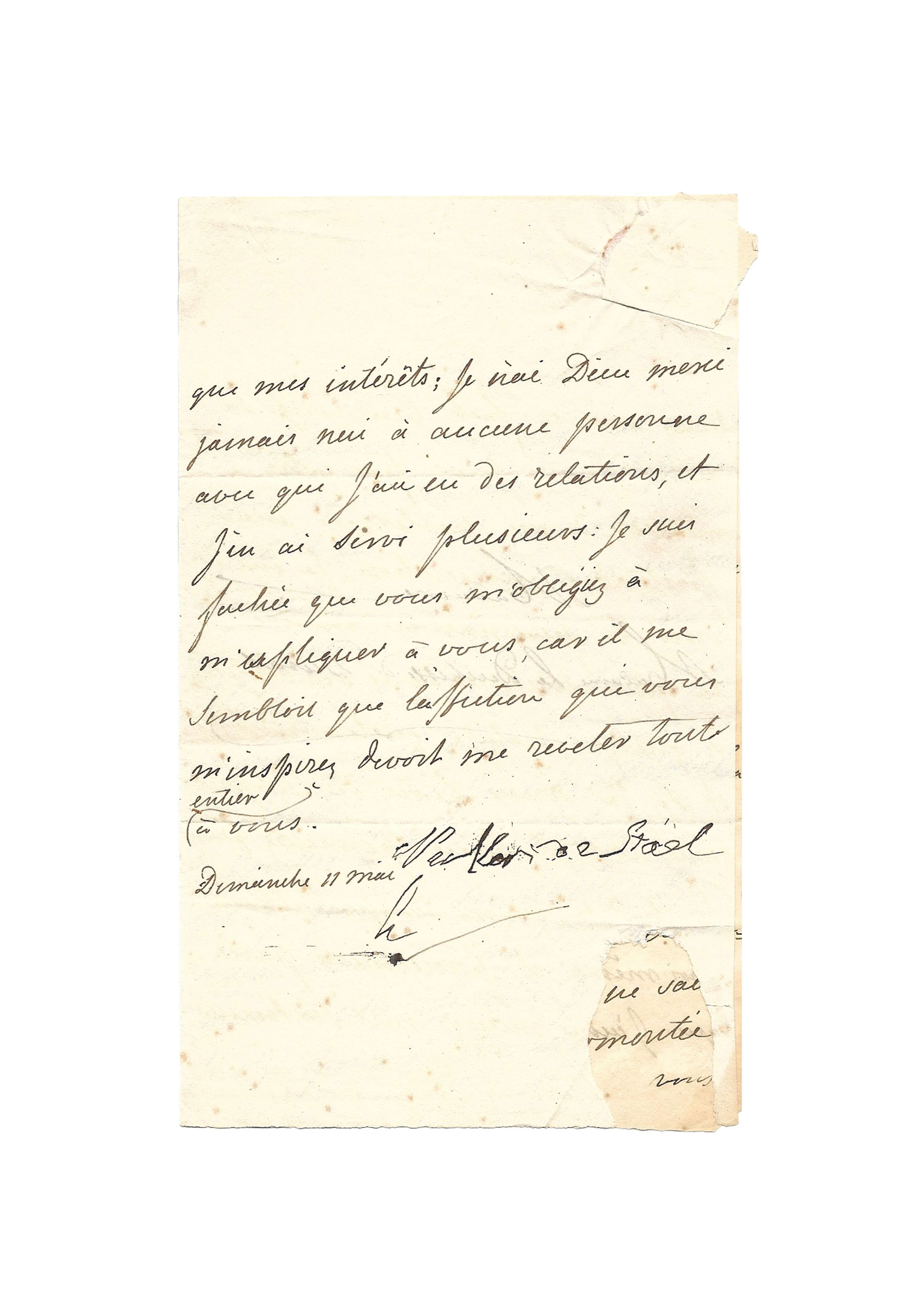 One of Germaine de Staël’s very last letters, bearing a twilight signature, evokes the Vallée-aux-Loups, which Chateaubriand was then seeking to part with