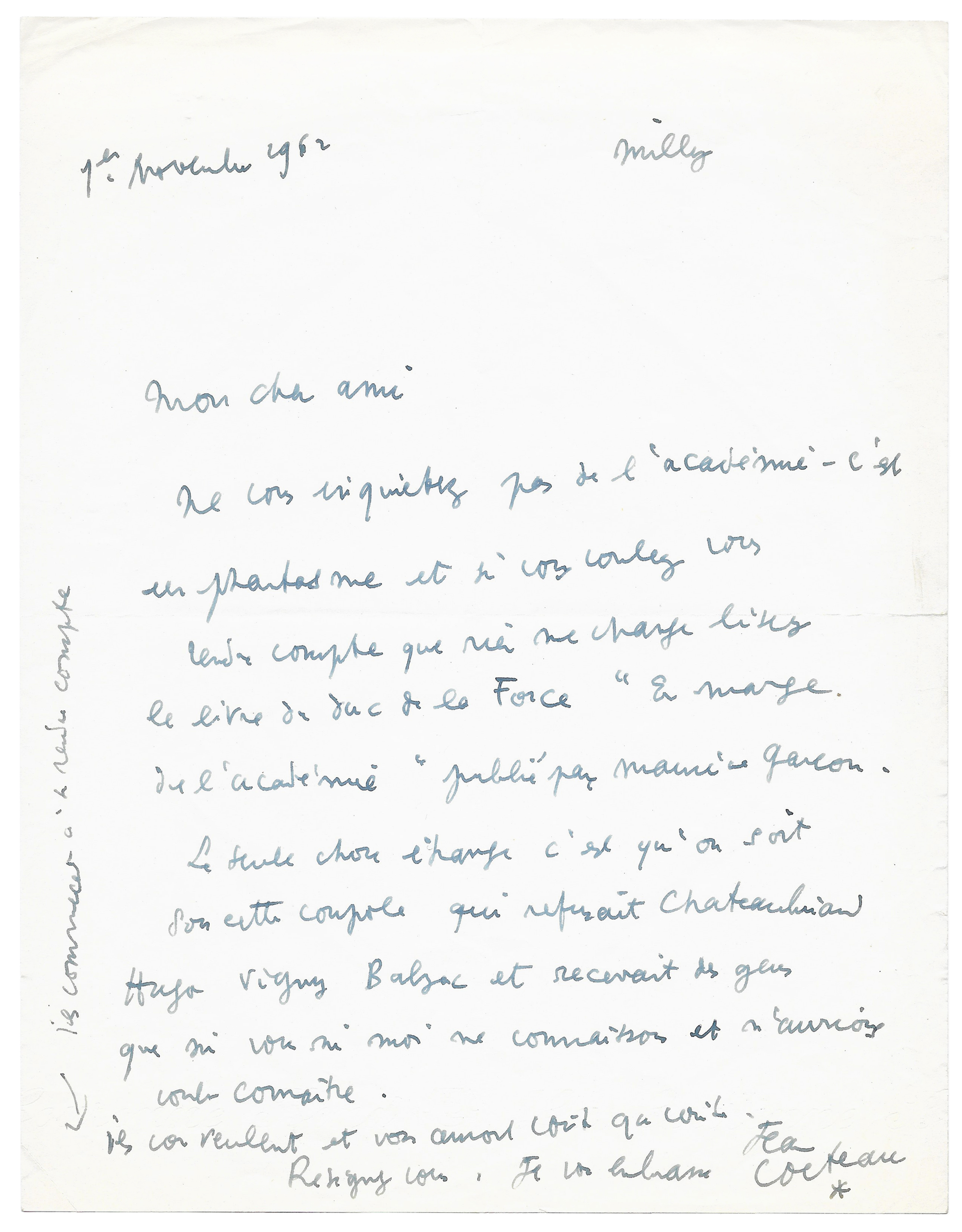 Autograph letter signed « Jean Cocteau » to Henry de Montherlant