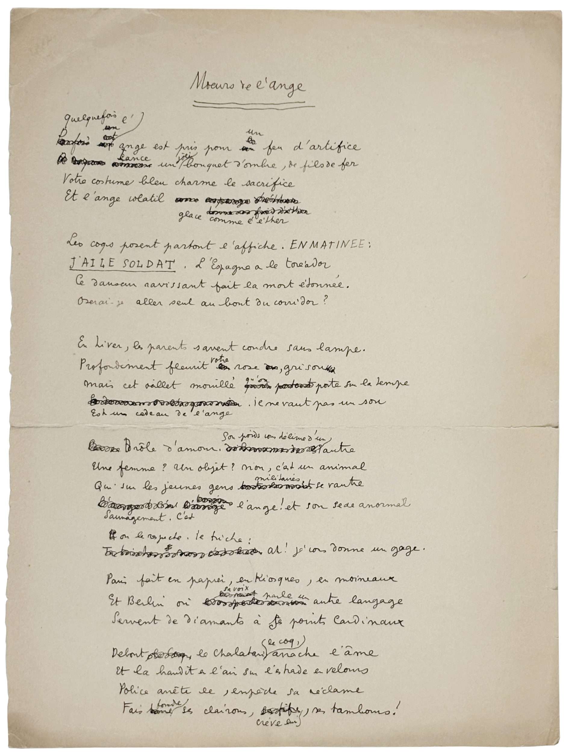 In his edition of Les Cahiers de L’Herne devoted to the poet, David Gullentops associates this long and beautiful poem with the creative period of Poésies (1917–1920). The themes it explores also foreshadow the angelic figure that would later appear in L’Ange Heurtebise (1925) — embodied by Cocteau himself in the first revival of Orphée in 1927. Here, the angel reveals his bestial nature, asserting himself upon young men through his disquieting difference and his “abnormal sex” — a provocation so explicit that the police intervene to suppress his sexual defiance.