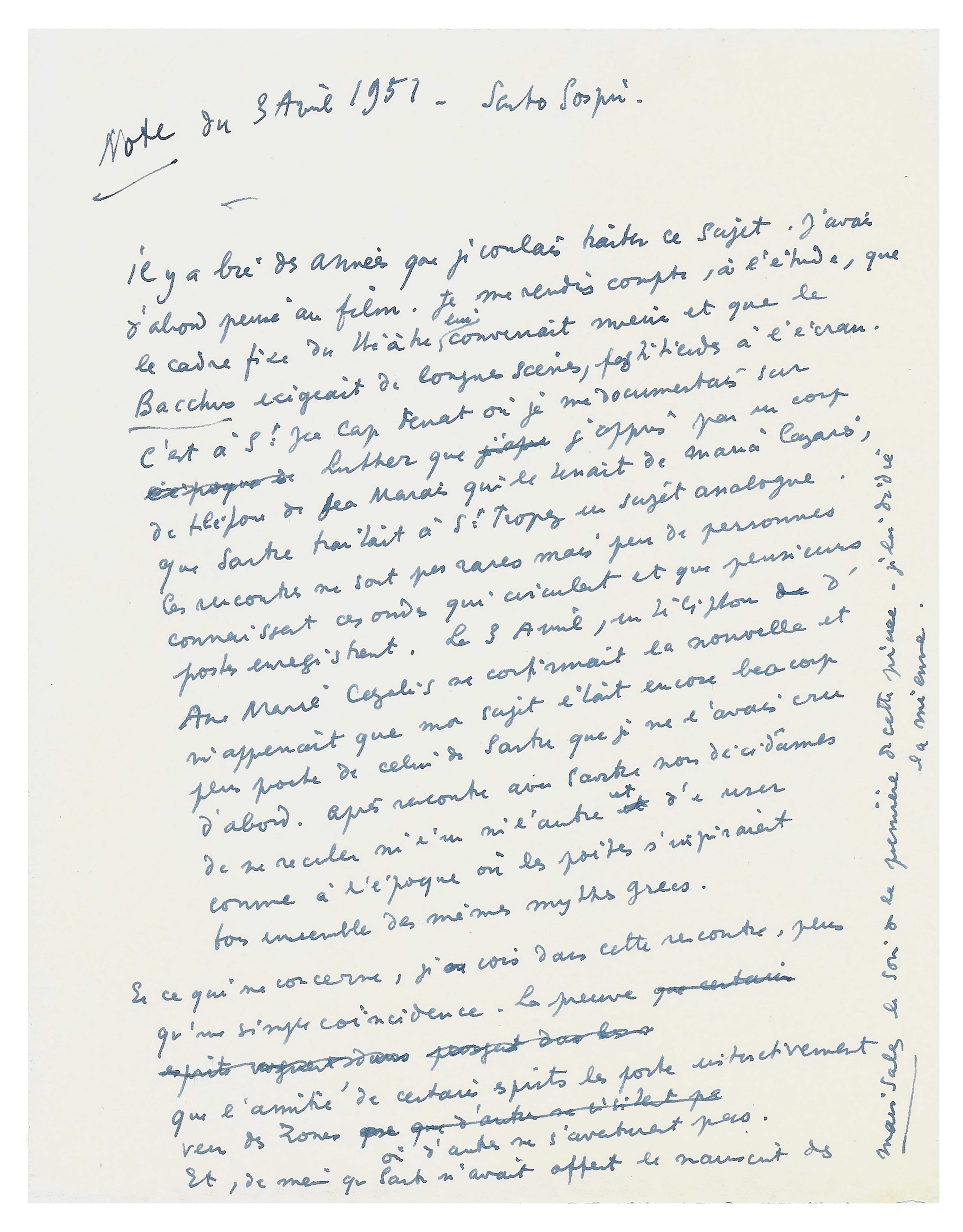 This is followed by the list of characters, together with an introductory notice situating the opening scene. Added to this is a particularly interesting autograph note by the author, dated and written at his home in his Santo Sospir villa on 3 April 1951. Having learned that Jean-Paul Sartre was working on a similar subject, Cocteau grew concerned and took the initiative to arrange a meeting. The two writers lunched together in Antibes in early April 1951. Cocteau emerged reassured as to the originality both of his theme and of his plot: “For many years I had wanted to treat this subject. I first thought of a film. On closer study, I realized that the fixed framework of the theatre was better suited, and that Bacchus required long scenes […]. It was in St-Jean-Cap-Ferrat, where I was researching Luther, that I learned through a telephone call from Jean Marais—who had it from Maria Casarès—that Sartre was dealing in St-Tropez with a similar subject. Such coincidences are not rare, but few people are aware of these waves that circulate and that several individuals register. On 3 April, a telephone call from Anne-Marie Cazalis confirmed the news and informed me that my subject was even closer to Sartre’s than I had at first believed. After meeting Sartre, we decided that neither of us would withdraw, and to proceed as in the days when poets all drew inspiration together from the same Greek myths […] And just as Sartre had offered me the manuscript of Les Mains sales on the opening night of that play, I dedicate mine to him.”