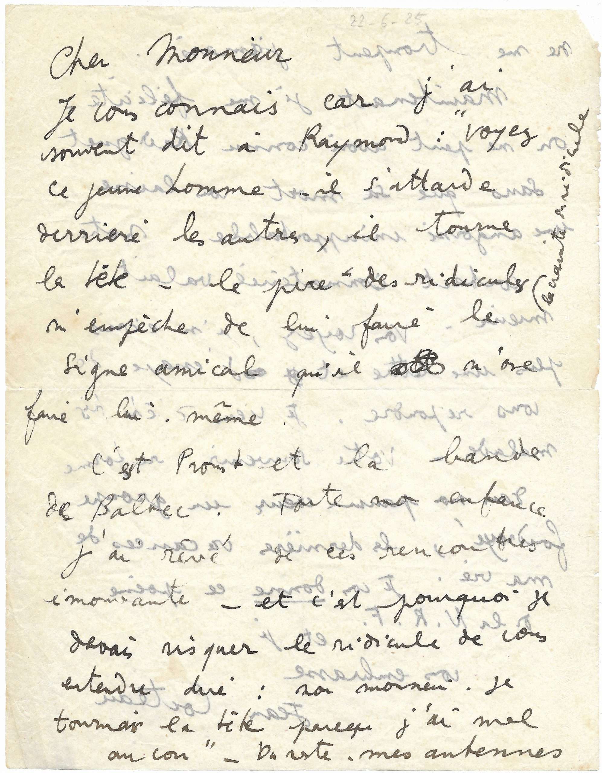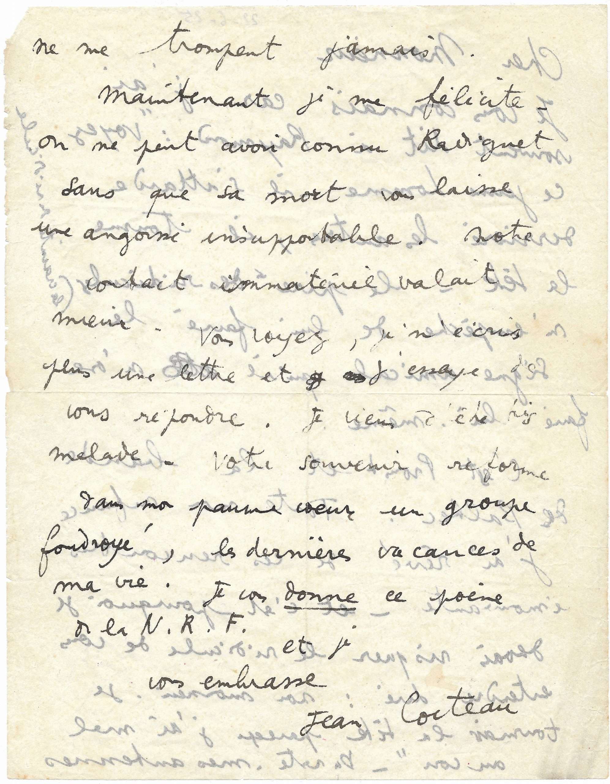 Je vous connais car j’ai souvent dit à Raymond [Radiguet]: « Voyez ce jeune homme, il s’attarde derrière les autres, il tourne la tête – le pire des ridicules m’empêche de lui faire le signe amical qu’il n’ose faire lui-même. C’est Proust et la bande de Balbec. Toute mon enfance j’ai rêvé de ces rencontres émouvantes – et c’est pourquoi je devais risquer le ridicule de vous entendre dire: « non Monsieur. Je tournais la tête parce que j’ai mal au cou ». Du reste, mes antennes ne me trompent jamais. Maintenant, je me félicite – On ne peut avoir connu Radiguet sans que sa mort vous laisse une angoisse insupportable. Notre contact immatériel valait mieux. Vous voyez, je n’écris plus une lettre et j’essaye de vous répondre. Je viens d’être très malade. Votre souvenir reforme dans mon pauvre coeur un groupe foudroyé, les dernières vacances de ma vie. Je vous donne ce poème de la N.R.F et je vous embrasse. Jean Cocteau