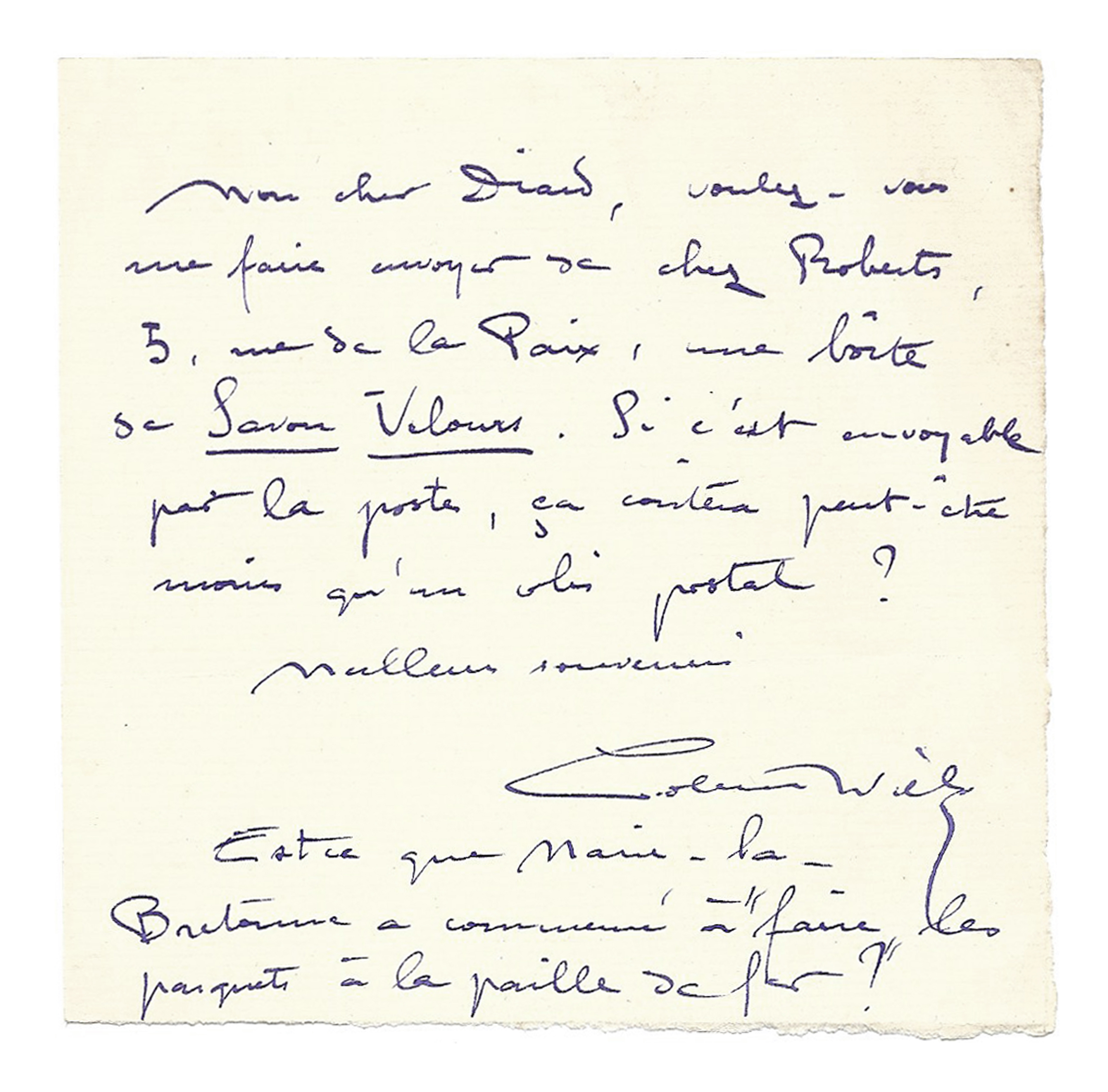 « Mon cher [Alfred] Diard, voulez-vous me faire envoyer de chez Roberts [célèbre pharmacie de l’époque], 5 rue de la Paix, une boîte de Savon Velours. Si c’est envoyable par la poste, ça coûtera peut-être moins qu’un colis postal ?