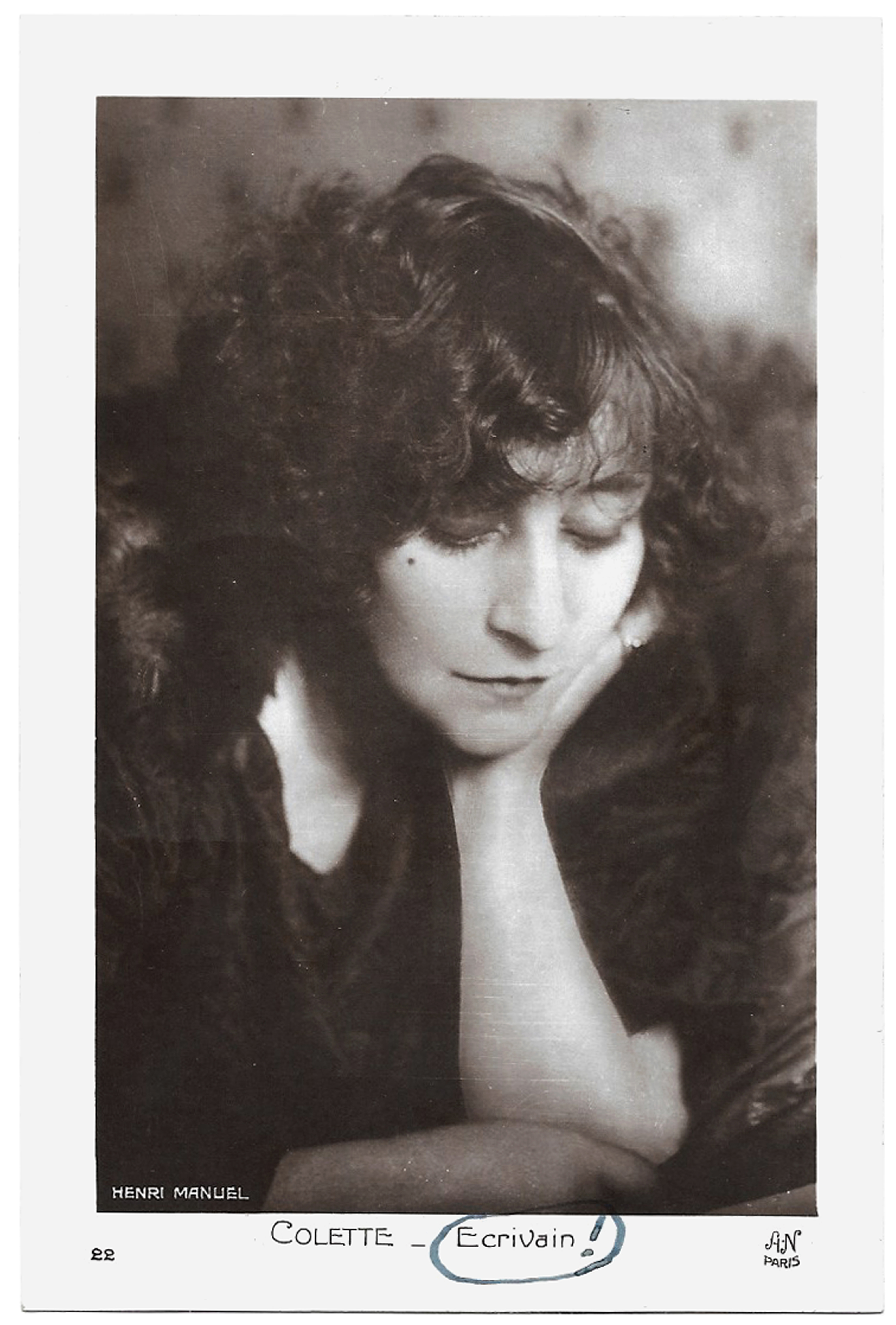 [On the front, a reproduction of her portrait by Henri Manuel. Colette circles the word “Writer” and ironically adds an exclamation point.]