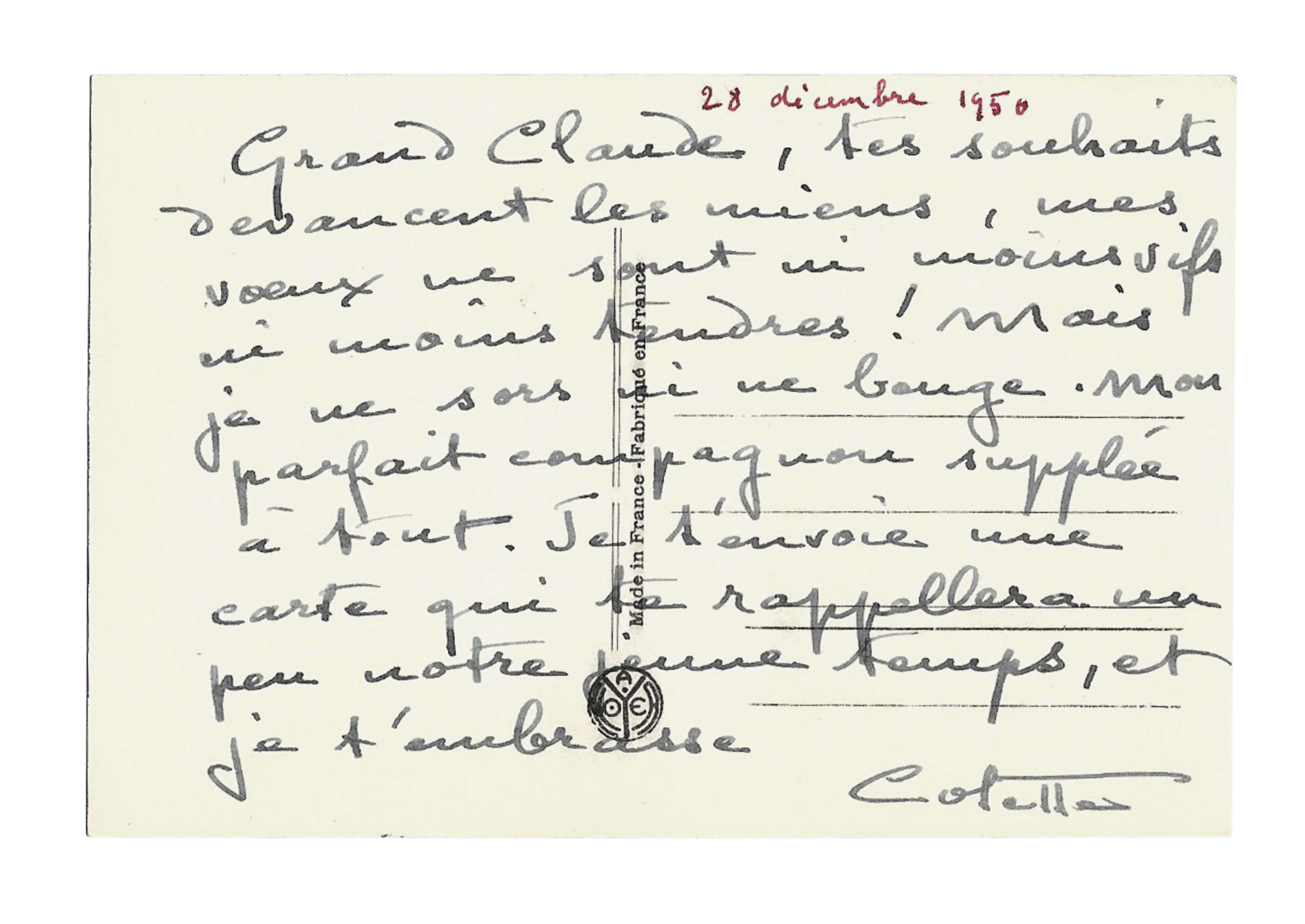 N.p.n.d. [Paris, 28 December 1950], 1 p. small in-8°
