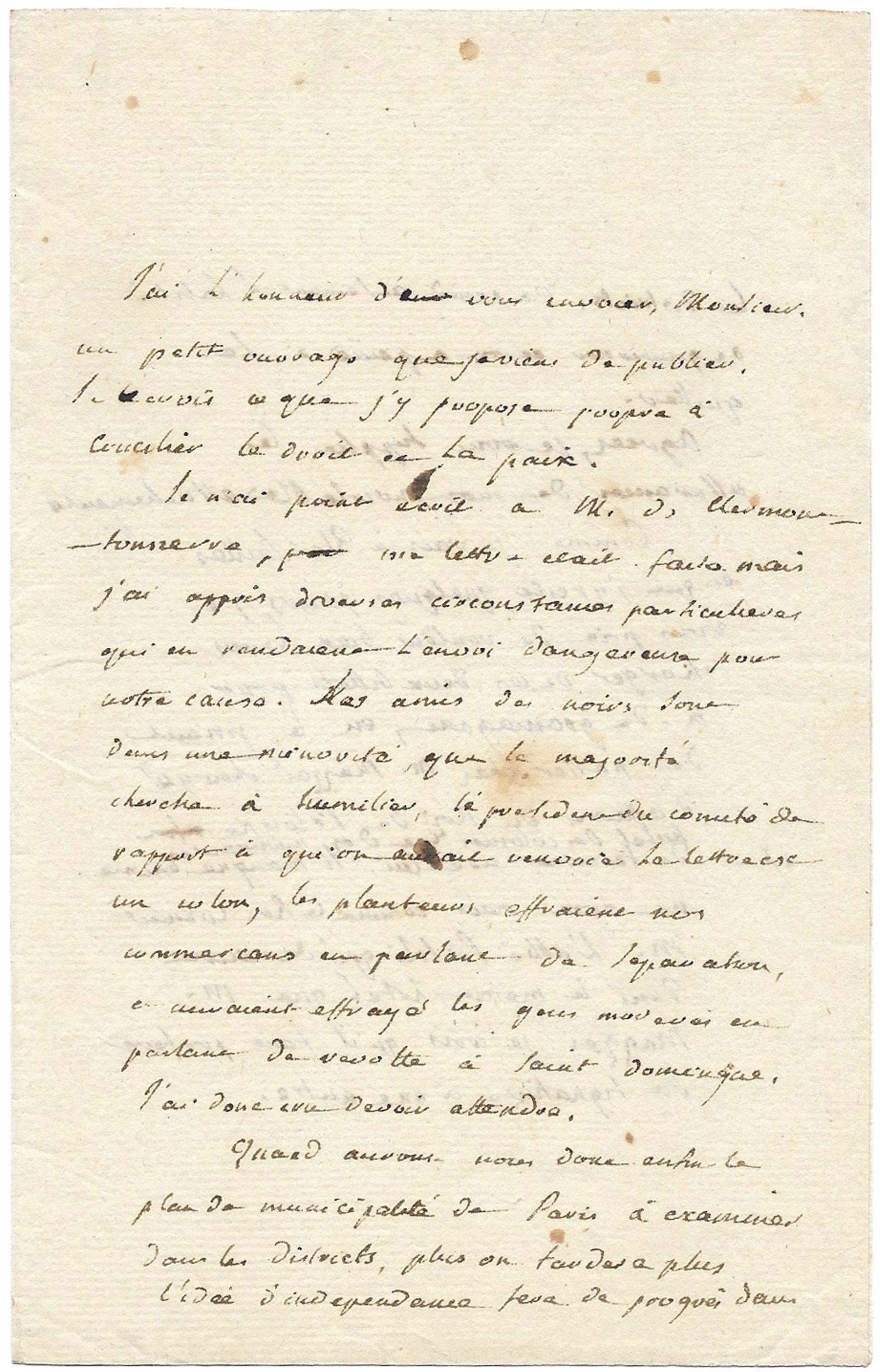 « J’ai l’honneur d’env de vous envoier, Monsieur, un petit ouvrage que je viens de publier [Sur l’admission des députés des planteurs de Saint Domingue, dans l’Assemblée nationale]. Je le crois ce que j’y propose propre á concilier le droit et la paix. Je n’ai point ecrit a M. de Clermont-Tonnerre, par ma lettre etait faite mais j’ai appris diverses circonstances particulieres qui en rendaient l’envoi dangereux pour notre cause. Les amis des noirs sont dans une minorité, que la majorité cherche à humilier, l’a le president du comité rapport à qui on aurait renvoie la lettre est un colon, les planteurs effraient nos commercans en parlant de separation, et auraient effrayé les gens moderés en parlant de revolte á Saint Domingue. J’ai donc cru devoir attendre.