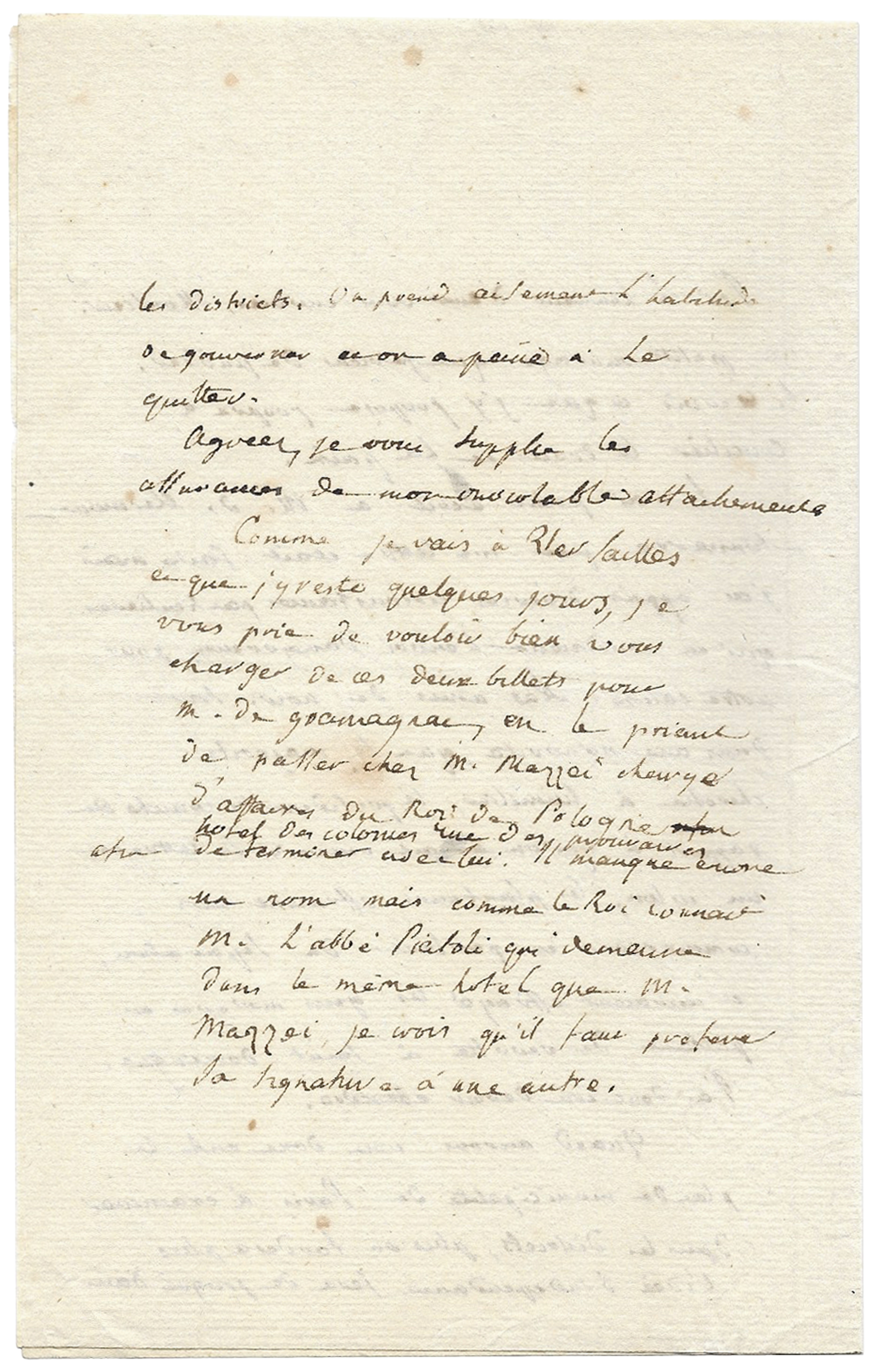 Comme je vais à Versailles et que j’y reste quelques jours, je vous prie de vouloir bien vous charger de ces deux billets pour M. de Gramagnac, en le priant de passer chez M. Mazzei chargé d’affaires du Roi de Pologne afin |hotel des colonies rue des Prouvaires| afin de terminer avec lui. Il manque encore un nom mais comme le Roi connait M. l’abbé Piatoli qui demeure dans le même hotel que M. Mazzei, je crois qu’il faut preferer sa signature á une autre »