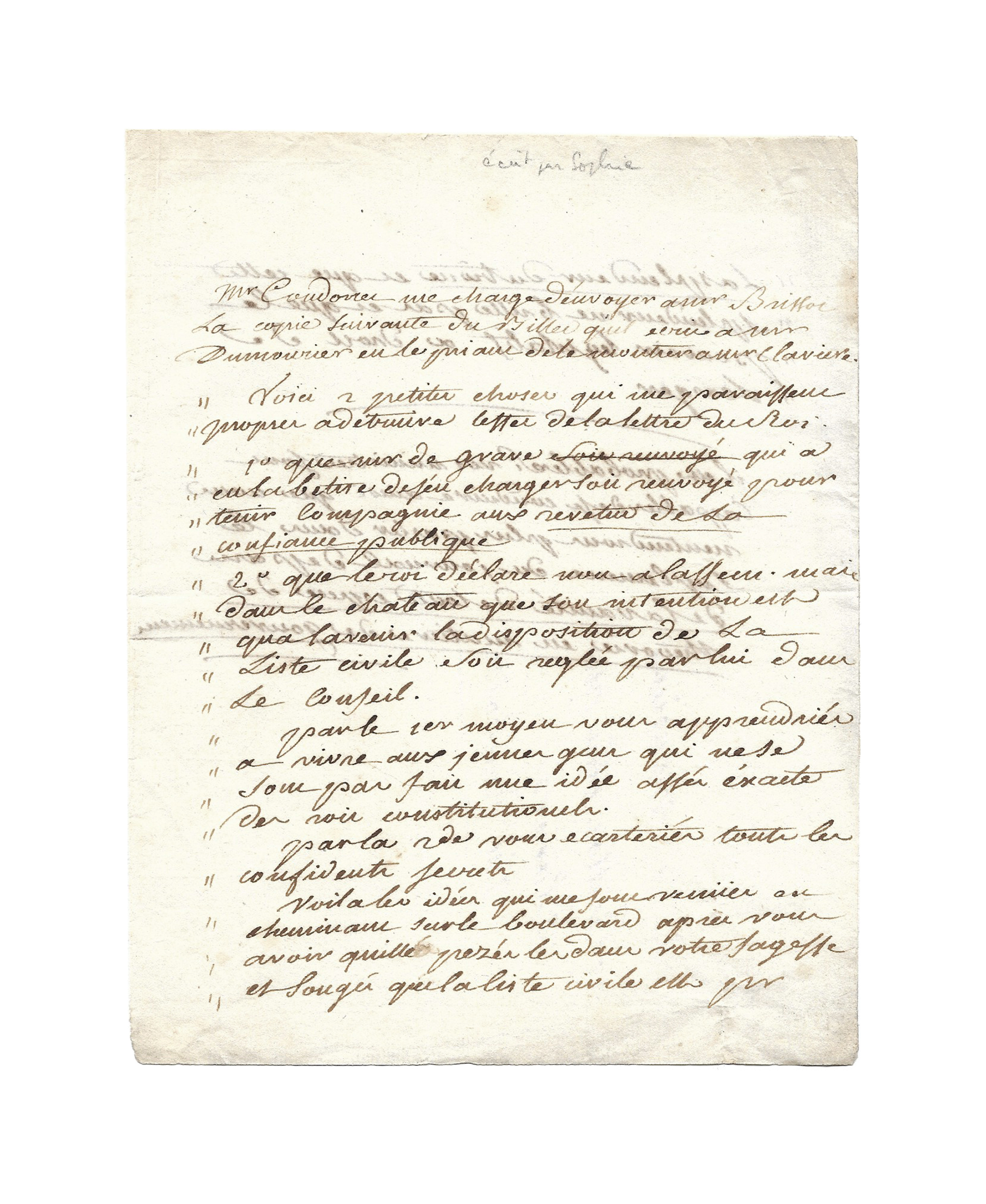 In this copy of a note from her husband to General Dumouriez, the leader of the Girondins is informed of Condorcet’s objections to a letter from Louis XVI on his civil list