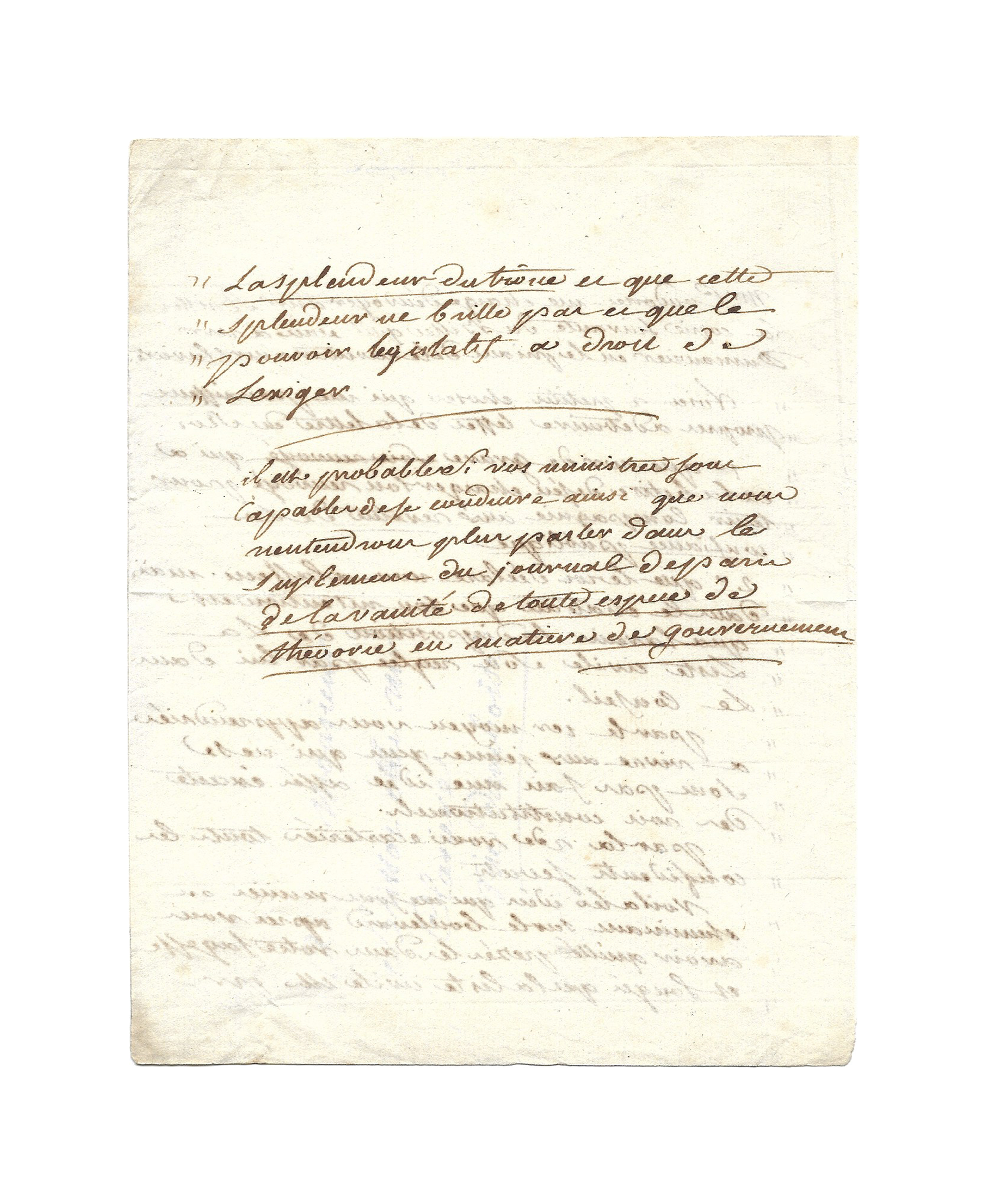 voila les idées qui me sont venües en cheminant sur le boulevard après vous avoir quitté pezés les dans votre sagesse et songés que la liste civile est pr La splendeur du trône et que cette splendeur ne brille pas et que le pouvoir legislatif a droit de Lexiger