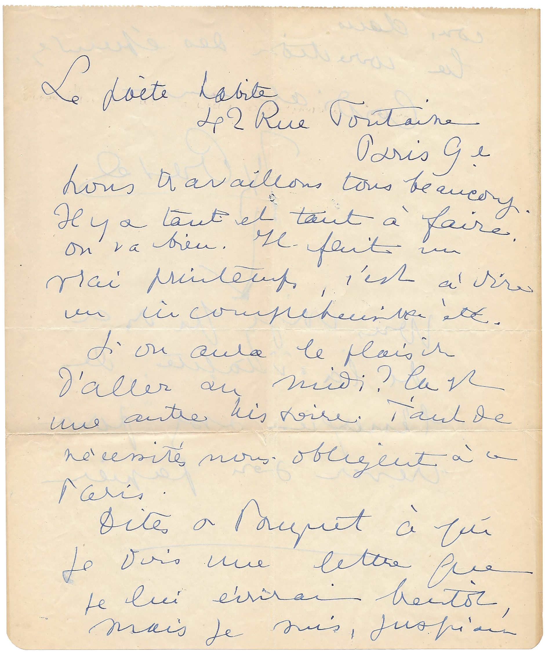 Staying with André Breton at 42 rue Fontaine, Crevel writes: « nous travaillons tous beaucoup. Il y a tant et tant à faire. On va bien. Il fait un vrai printemps, c’est à dire un incompréhensible été.