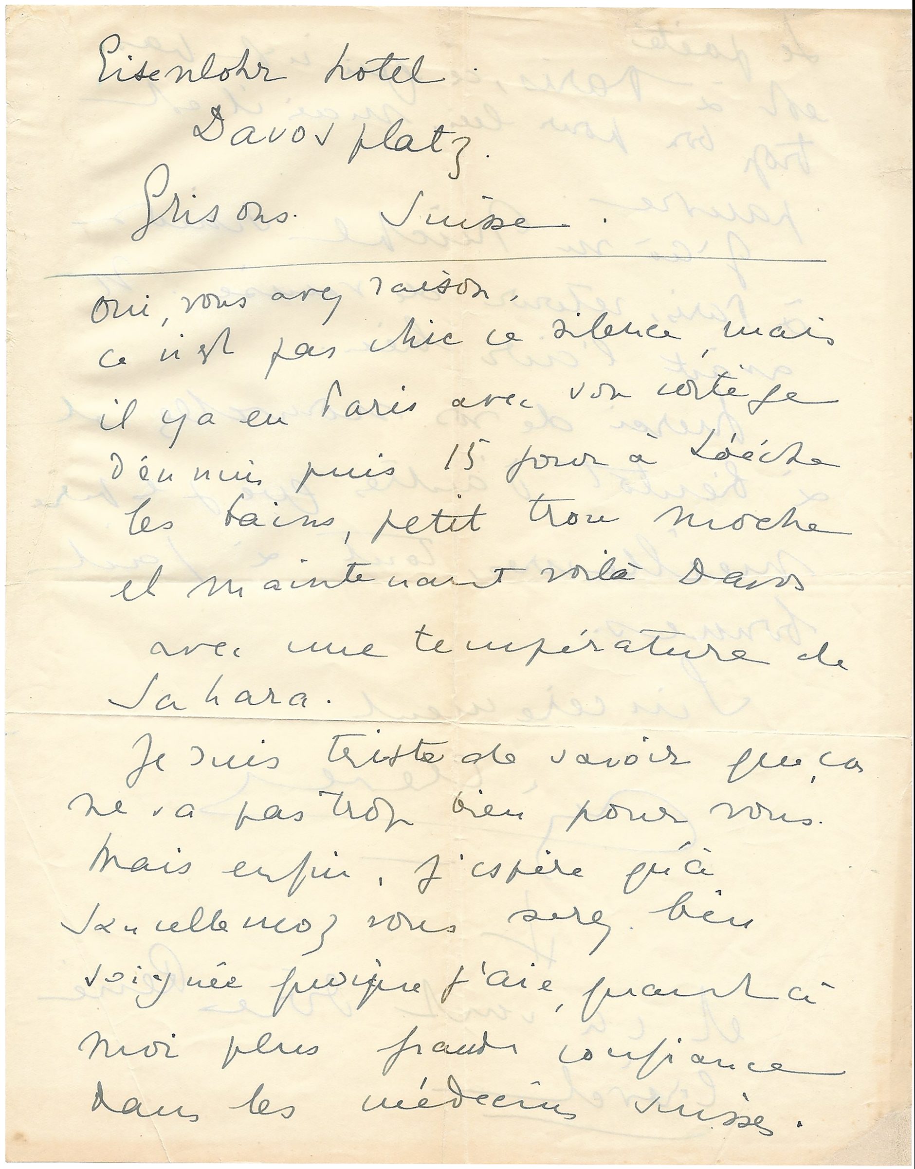 In the second letter, sent from the Davos Platz sanatorium in Switzerland, he apologizes to his correspondent for his prolonged silence: « Oui, vous avez raison, ce n’est pas chic ce silence, mais il y a eu Paris avec son cortège d’ennuis, puis 15 jours à Loèche-les-Bains, petit trou miche et maintenant voilà Davos avec une température de Sahara.